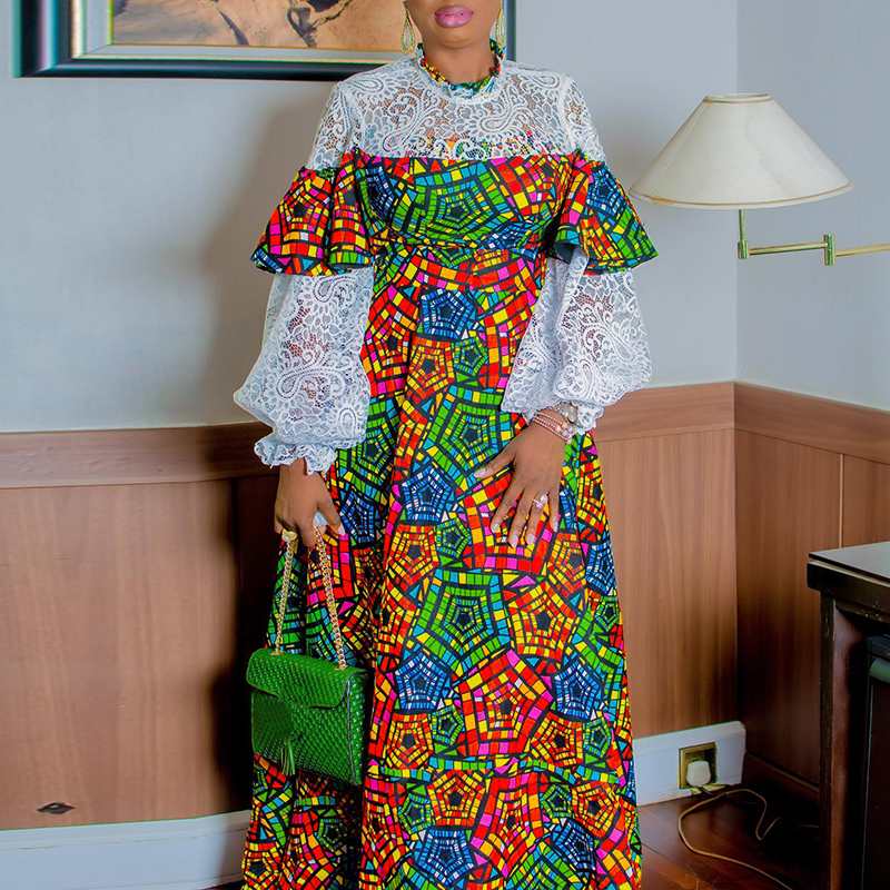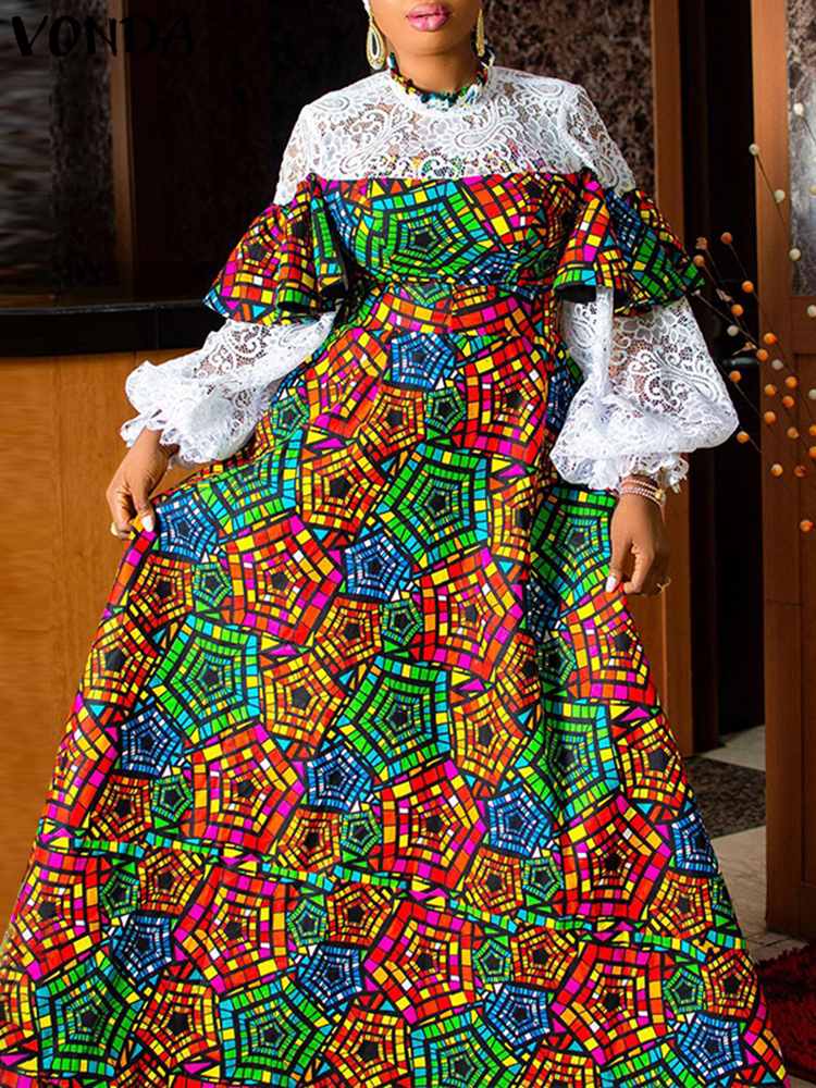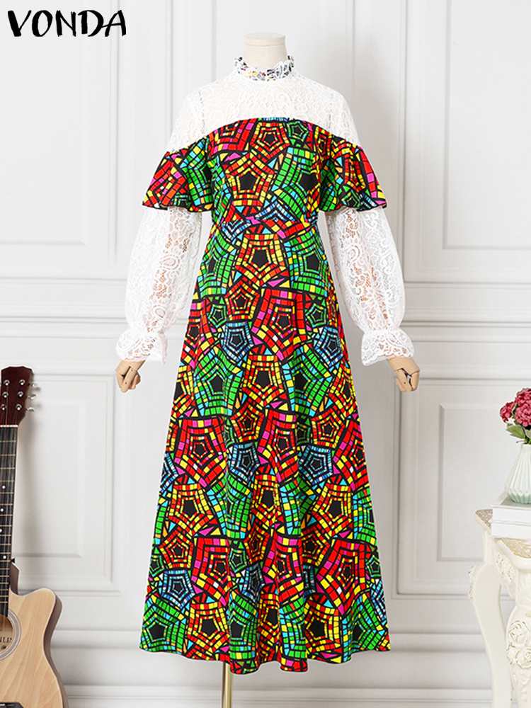 VONDA Evening Party Dress 2022 Summer High Neck Women Long Sleeve Lace Patchwork Vintage Printed Bohemian Pleated Maxi Dresses