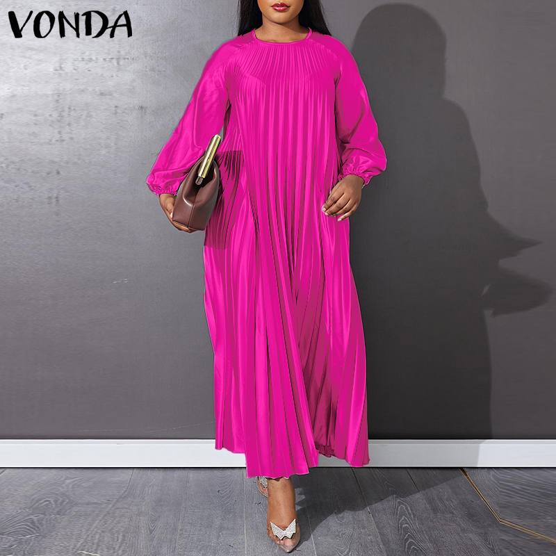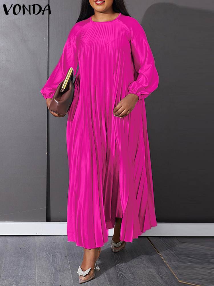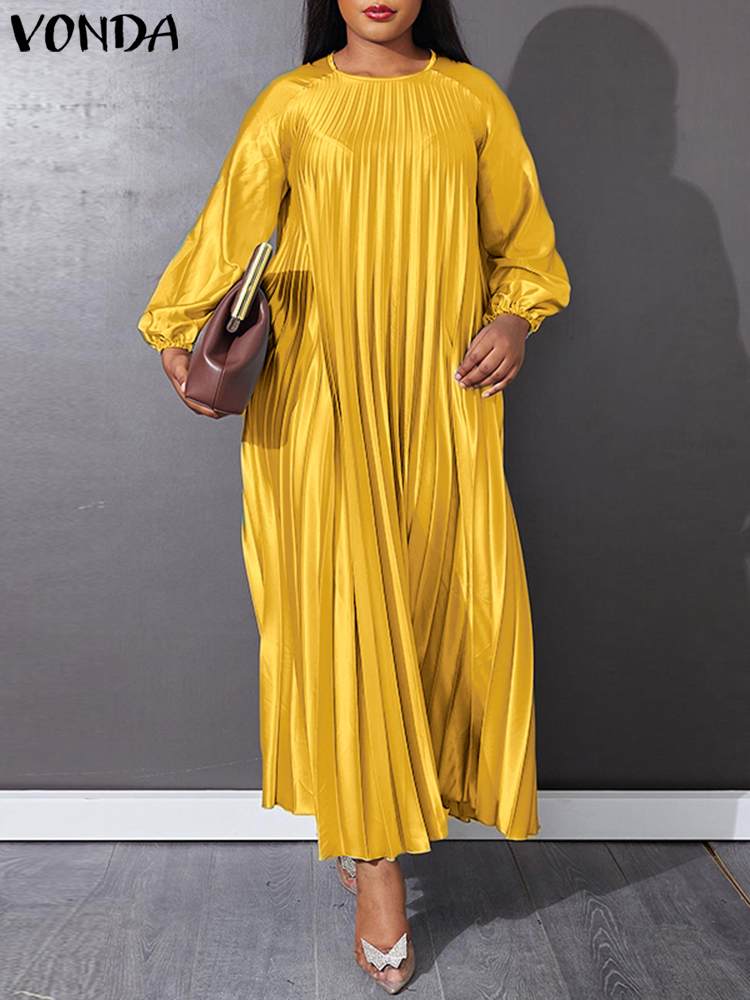VONDA Long Dresses 2022 Women Long Sleeve Vestidos Female A-Line Solid O-Neck Loose Satin Slik Robes Pleated Sundress Oversize
