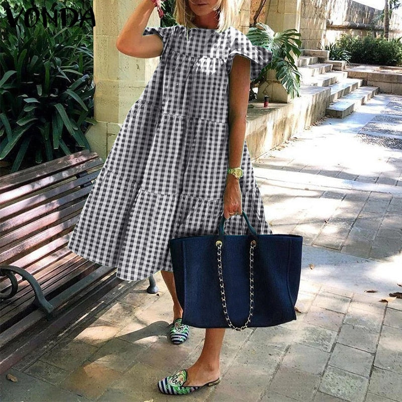 VONDA Summer Cotton Dress Women Casual Short Sleeve Ruffled Cuff Dresses Loose Patchwork Bohemian Vestidos  Knee-Length Dress