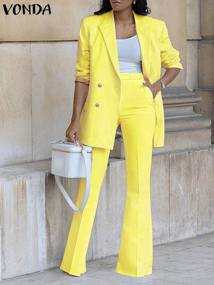 VONDA Women Thin Blazer Sets Solid Trousers Suit Long Sleeve Pants Suits Ladies High Waist Zipper Long Matching Set Oversized