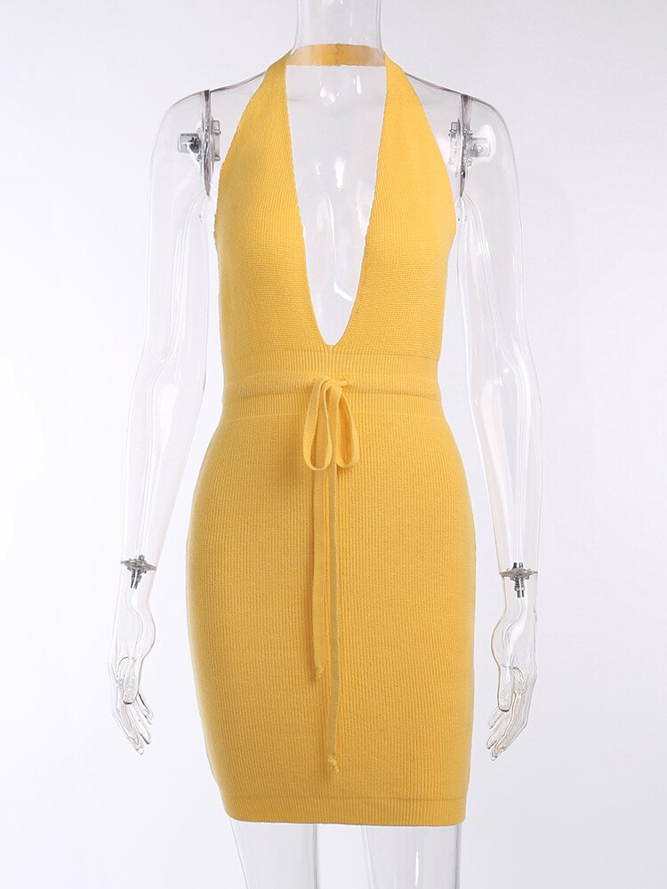 WannaThis Bodycon Mini Dress Bandage Sexy Backless Y2K Knit Deep V Neck Sleeveless Women Partywear Elegant Holiday Dresses 2022
