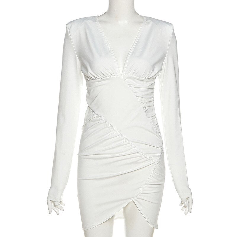 WannaThis Deep V Neck Long Sleeve Mini Dress For Women Ruched Elegant Autumn Office Lady Sexy Bodycon Fashion White Dresses 2021