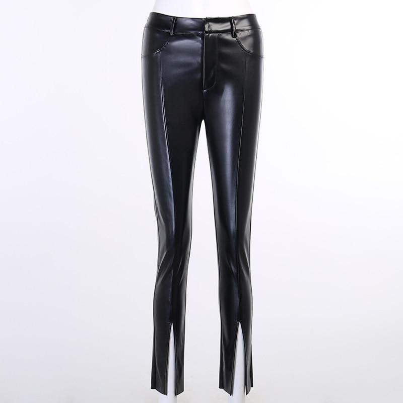 WannaThis High Waist Faux Leather Women's Pants Hem Split Black Brown Autumn Casual Ladies Streetwear PU Trousers Pencil Pants 1011-1
