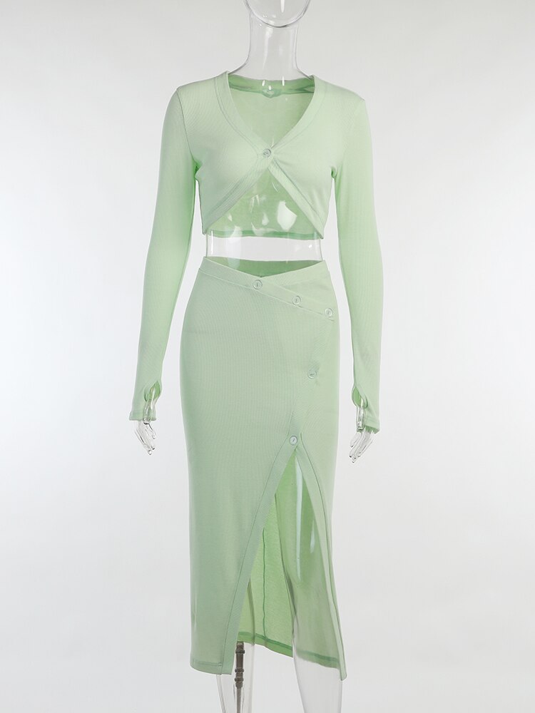 WannaThis Knitted 2 Piece Set Women Button V Neck Long Sleeve Waist Tops Button Skirts Women Sexy Slim Split Elegant Skirts Set