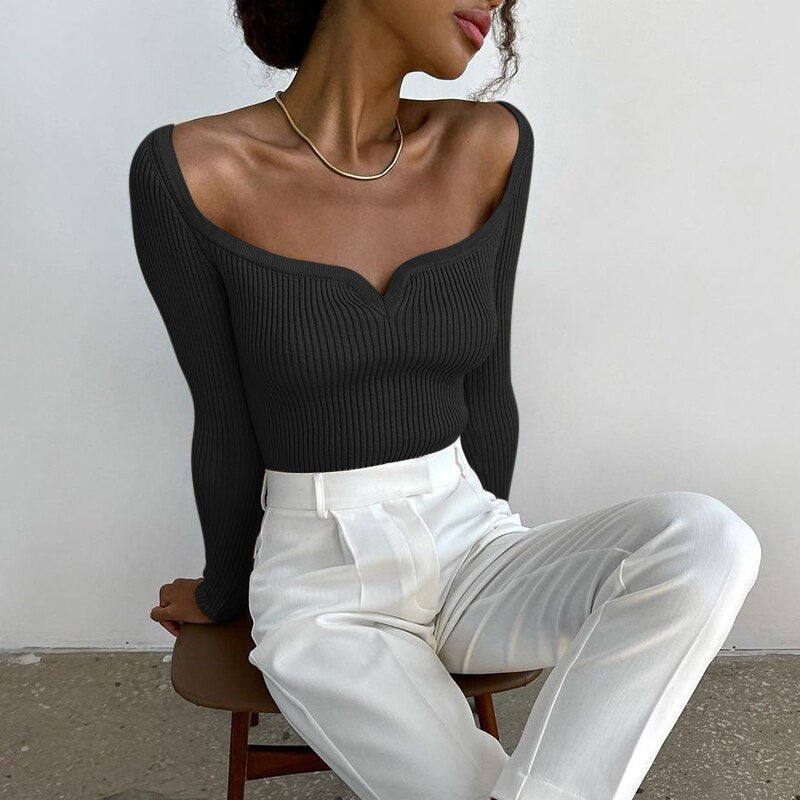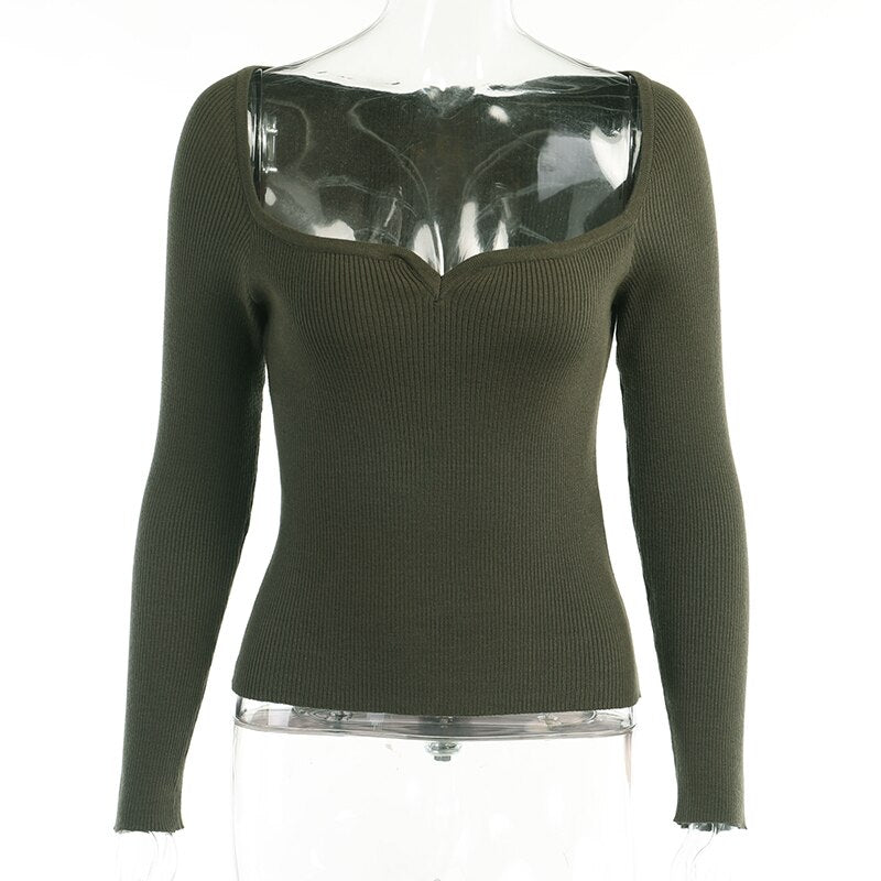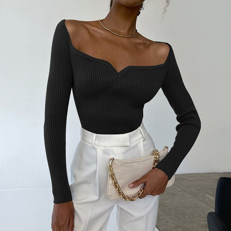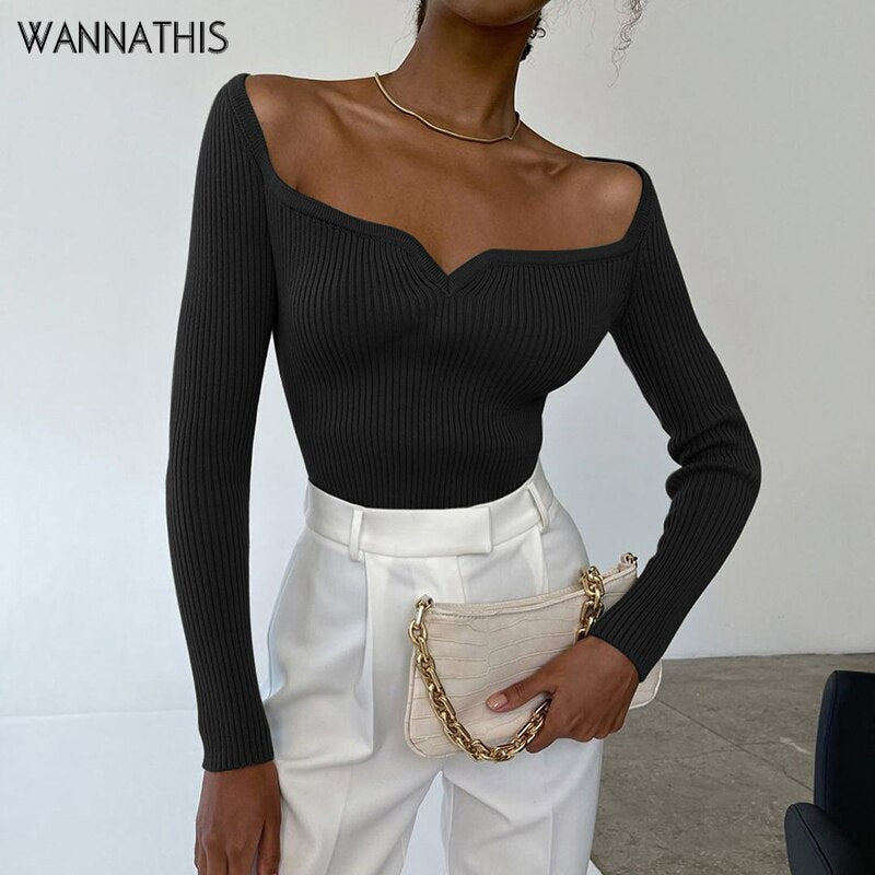 WannaThis Knitted Square Collar Tops Women Sexy Long Sleeve Women Slim Minimalist Autumn 2021 Basic Korean Black Casual T-shirts