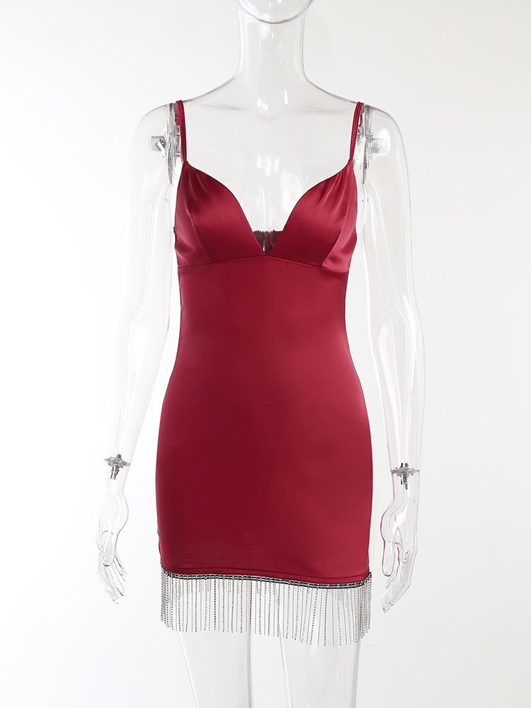 WannaThis Satin Women Tassel Cami Mini Dress Sleeveless Deep V Neck Summer Bodycon Sexy Fashion Party Nightclub Christmas Dress