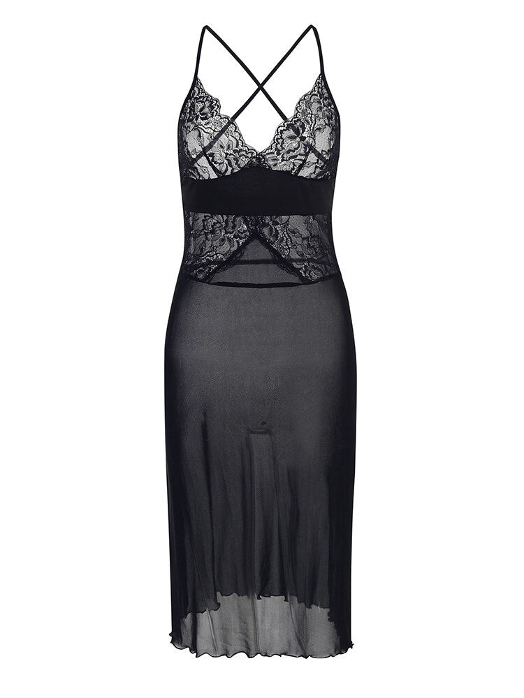 WannaThis Sexy Lace Women Cami Knee Dress Backless Sleeveless Summer Mesh See Through Bodycon Hot Erotic Fashion Clubwear Dress