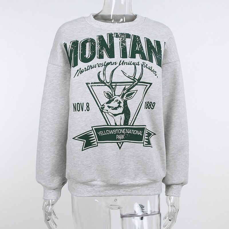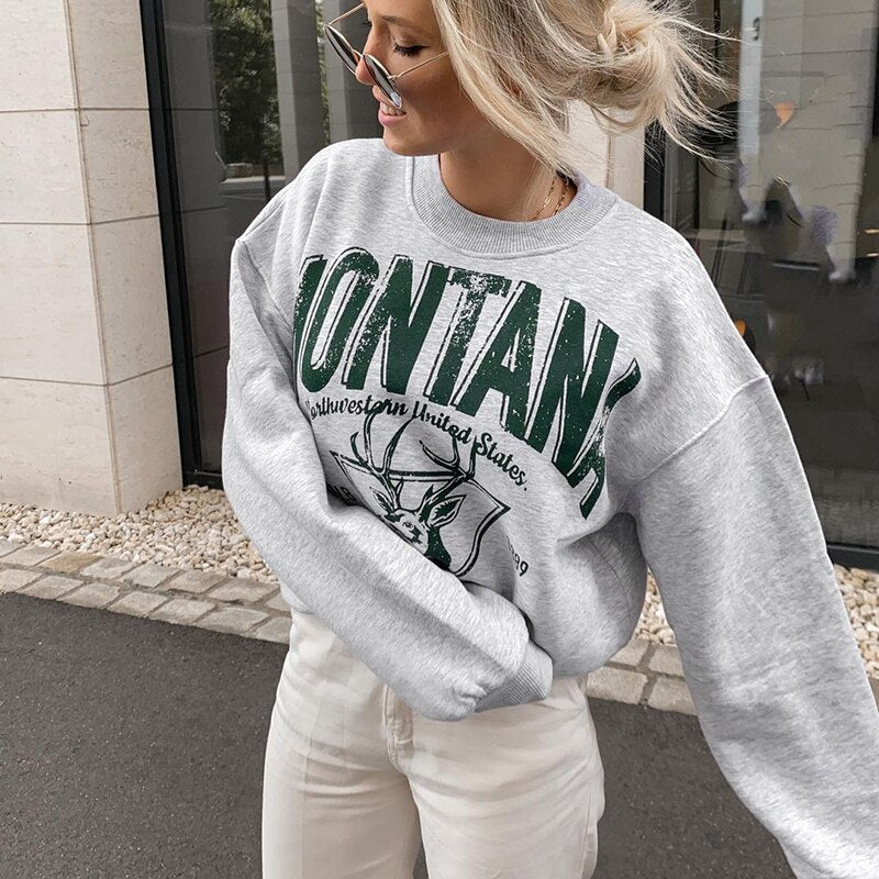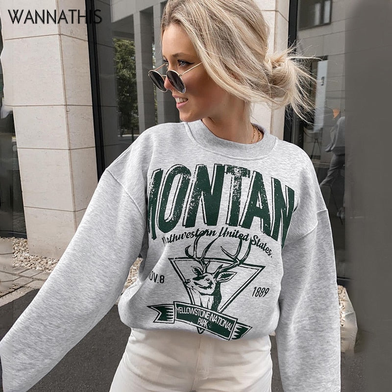 WannaThis Sweatshirts Long Sleeve Cotton Round Neck Grey Letter Printing Loose Top Autumn Retro Fashion Tracksuits Harajuku 2021