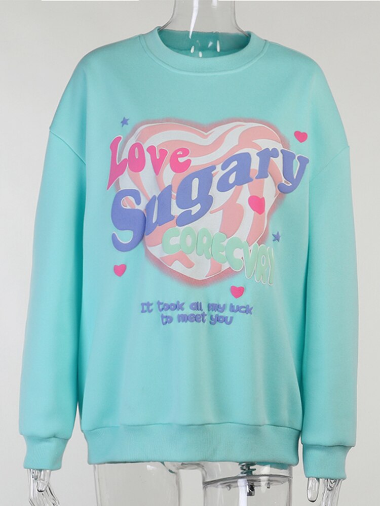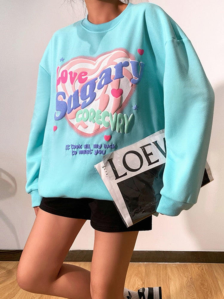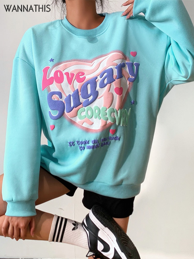 WannaThis Sweet Love Printing Oversize Sweatshirts Cotton Fitness O Neck Long Sleeve Pullover Autumn Winter Harajuku Kawaii Top
