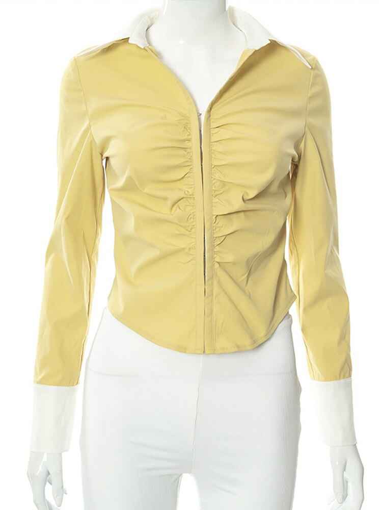 WannaThis Turn Down Collar Cropped Tops Office Lady Skinny Korean Fashion Hook Ladies Sexy Long Sleeve Folds Autumn T-Shirt 2021