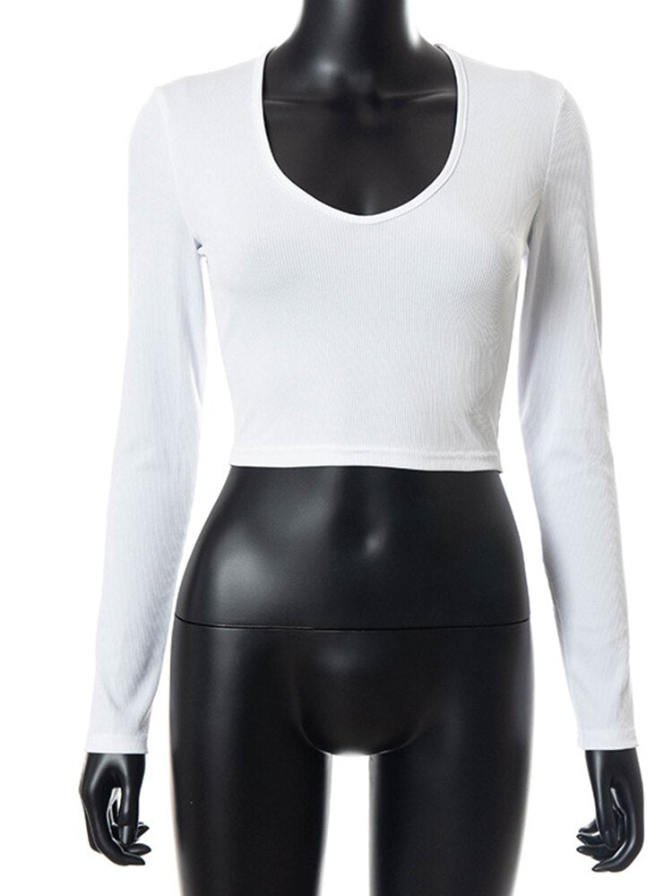 WannaThis V Neck Cropped Tops White Casual Skinny Korean Fashion Ladies Sexy Long Sleeve Waist 2021 Autumn Sport Basic T-Shirt
