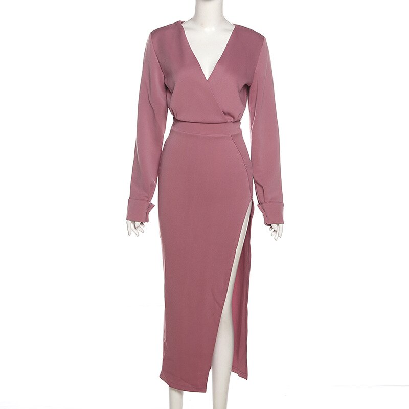 WannaThis V Neck Long Sleeve Midi Dresses High Split  Autumn 2021 Vintage Chic Party Wear Elegant Female White Aesthetic Dresses