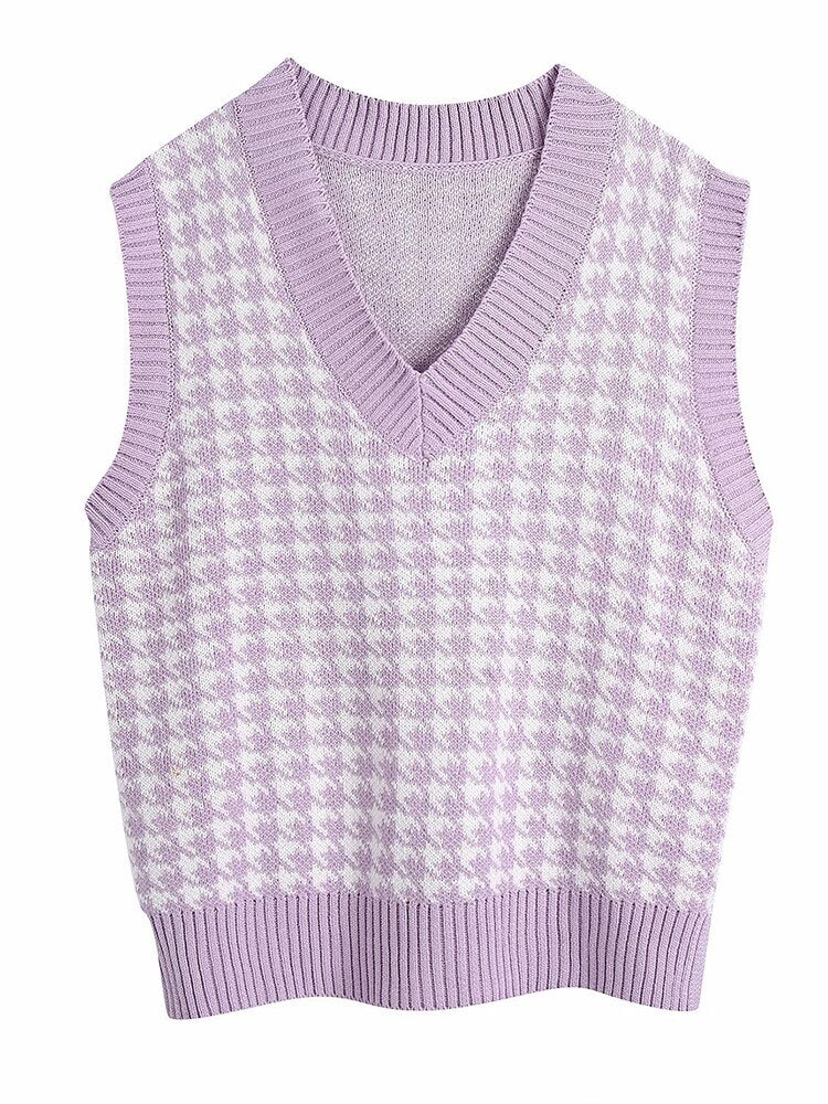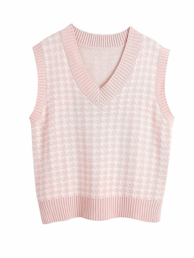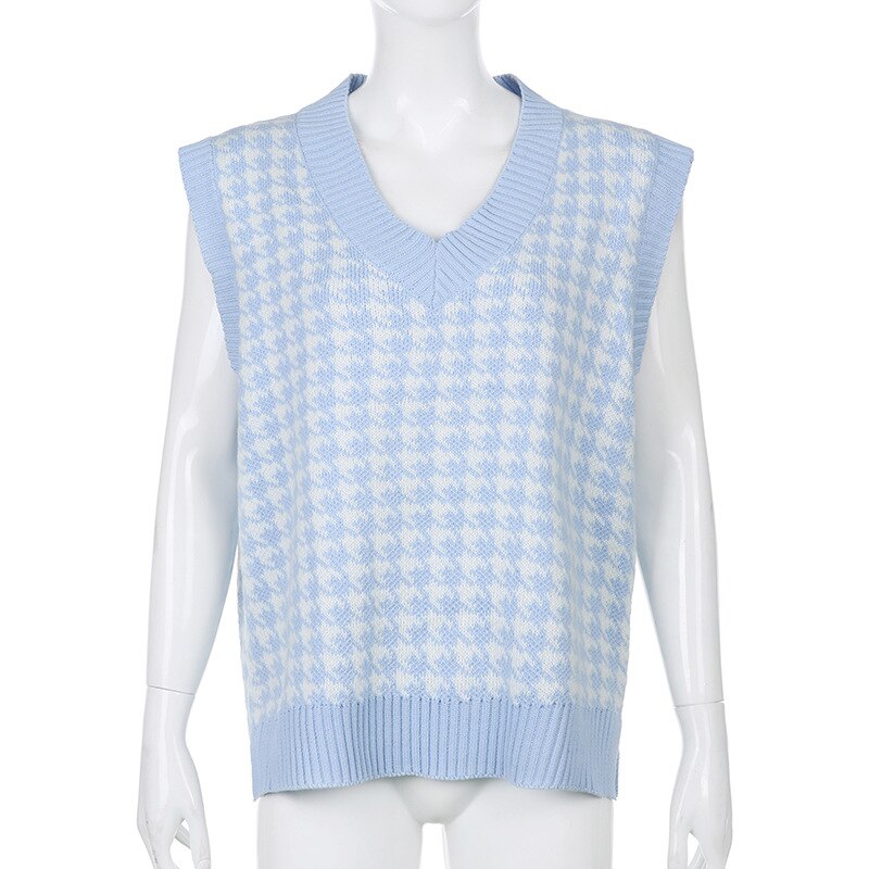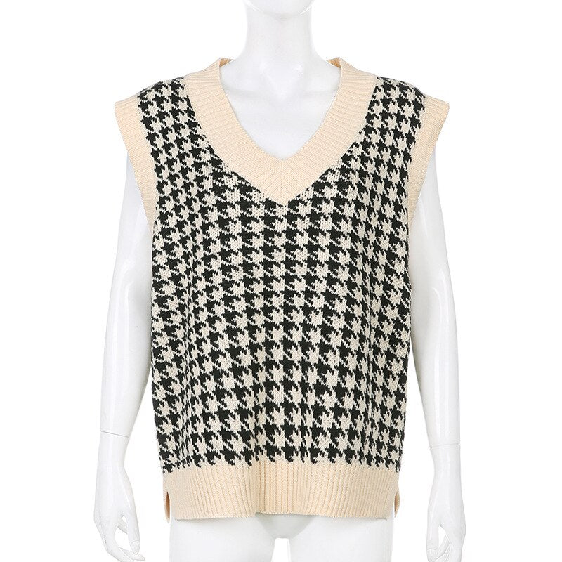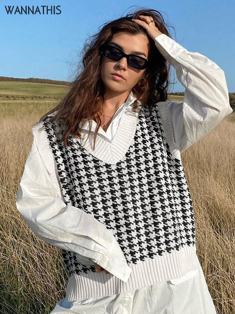 WannaThis V-neck Sweaters Women Sleeveless Print Casual Y2K Loose England Style Patchwork Knit Autumn Winter Tank Tops Fashion