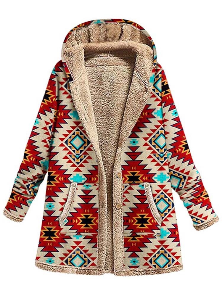 Winter Fleece Warm Hooded Jacket Women Fashion Ethnic Print Long Sleeve Vintage Coat Female Streetwear Oversize Outwear 2022 New