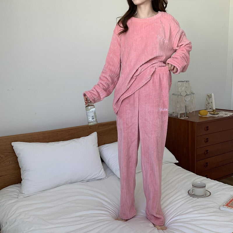 Winter Warm Women Pajamas Set Flannel Pajamas Homewear Sweatshirt Hoodies Thick Female Sleepwear Plush Pyjamas Suit Solid Color