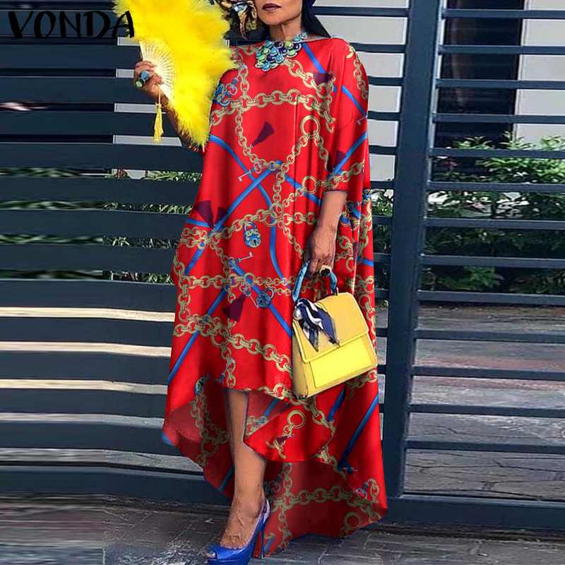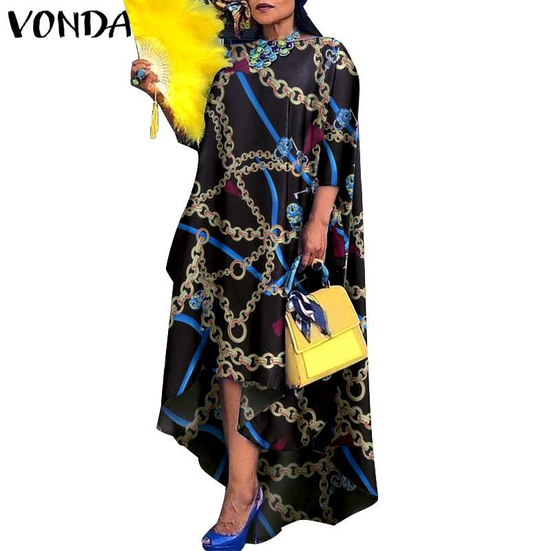 Women Dress 2022 VONDA Vintage Printed Asymmetric Party Long Maxi Dress Femme Robe Beach Sundress Casual Vestido Plus Size Robe