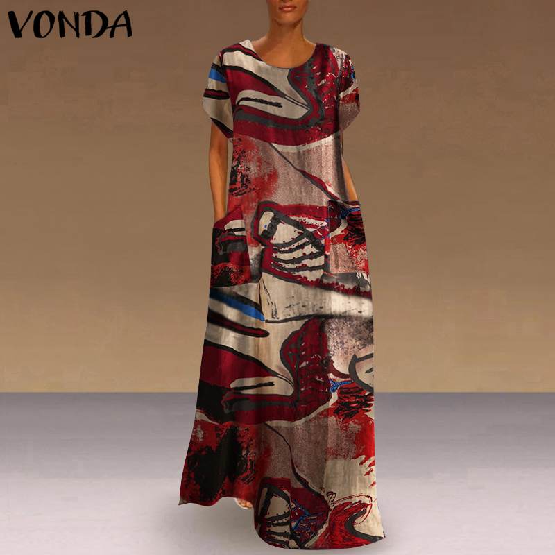 Women Dress Vintage Printed Dress Short Sleeve Robe VONDA Female Casual Bohemian Summer Beach Sundress