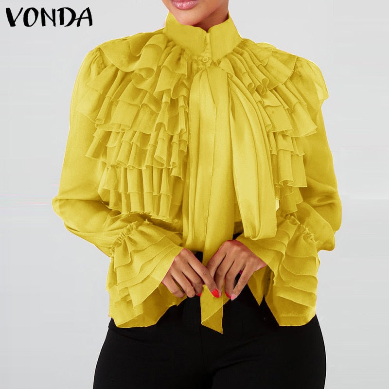 Women Elegant Blouse OL Style Stand Collar Shirts Ruffled Tops 2022 VONDA Female Casual Baggy Blusas Femininas