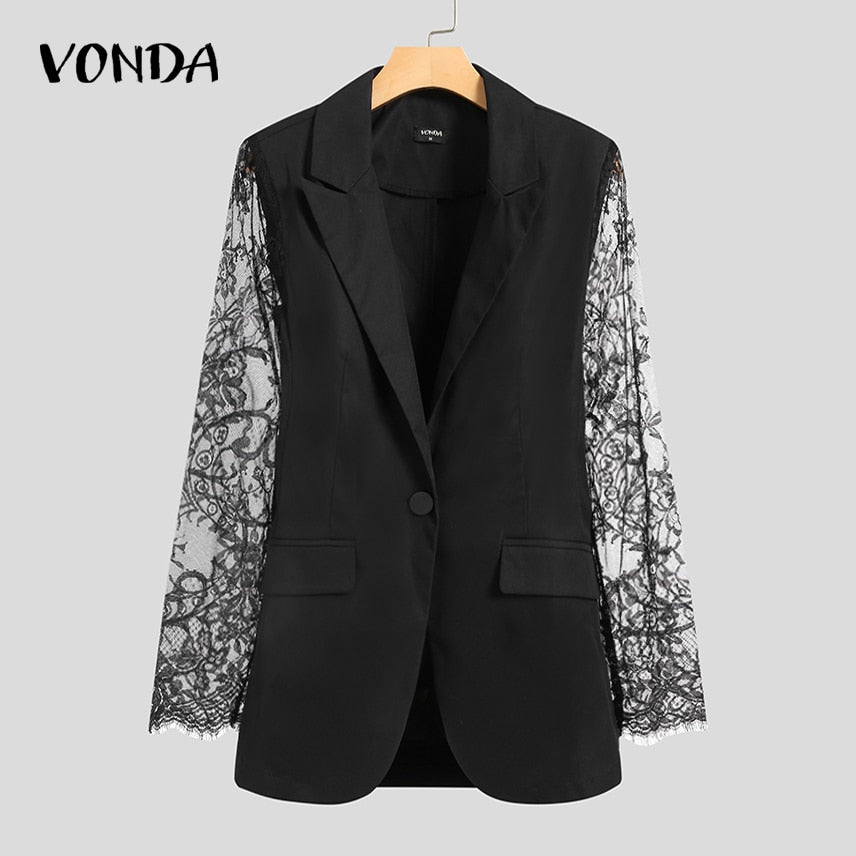 Women Elegant Office Jackets 2022 VONDA Long Sleeve Button Up Lace Patchwork Jackets Casual Coat Solid Color Lapel Collar Coats
