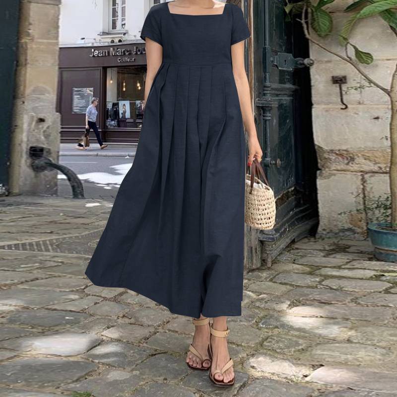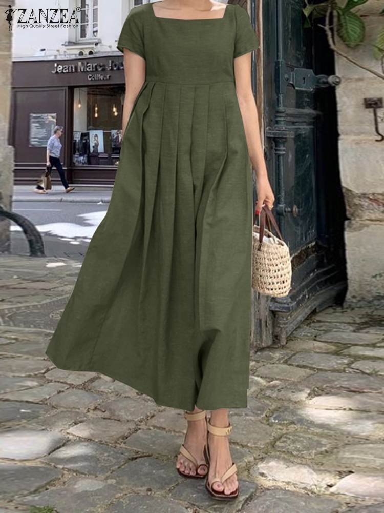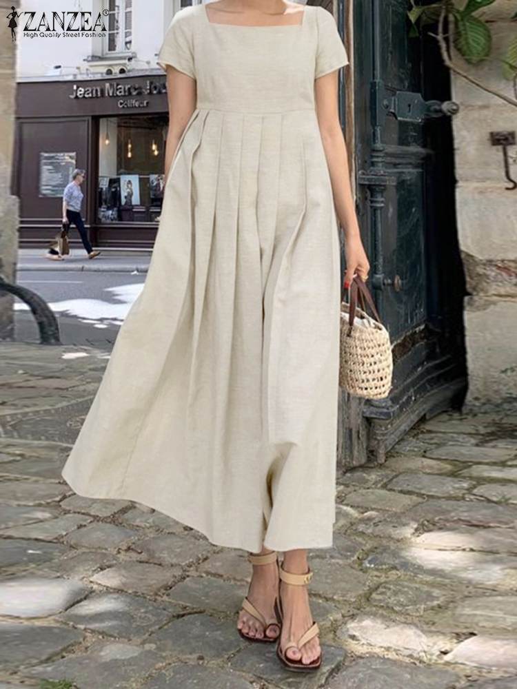 Women Elegant Short Sleeve Beach Dress 2022 ZANZEA Fashion Summer Square Neck Party Midi Sundress Casual Solid Vestidos Kaftan