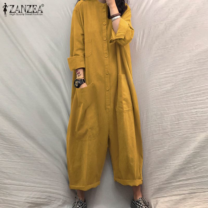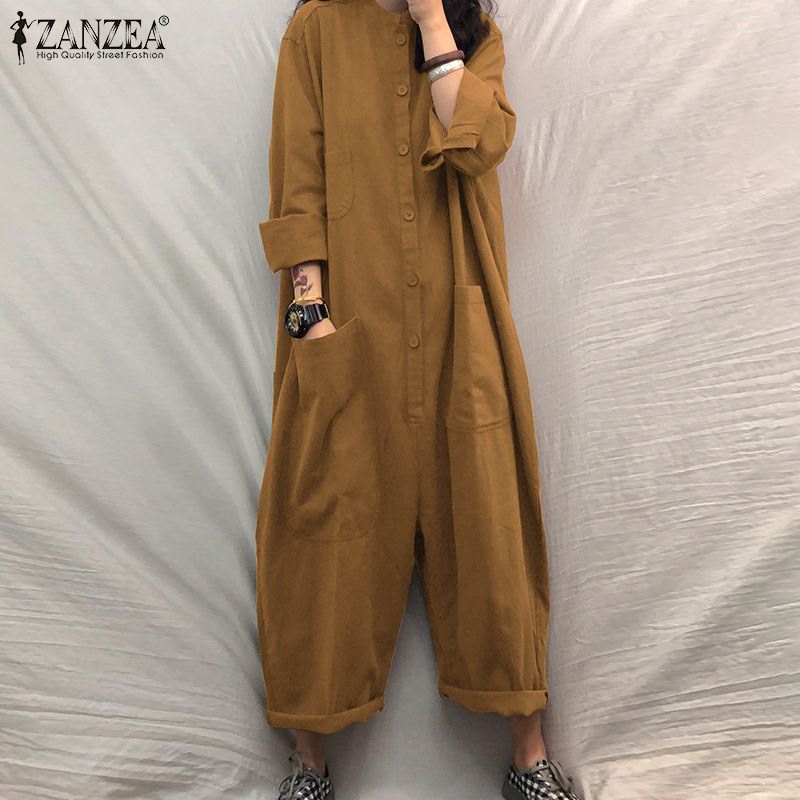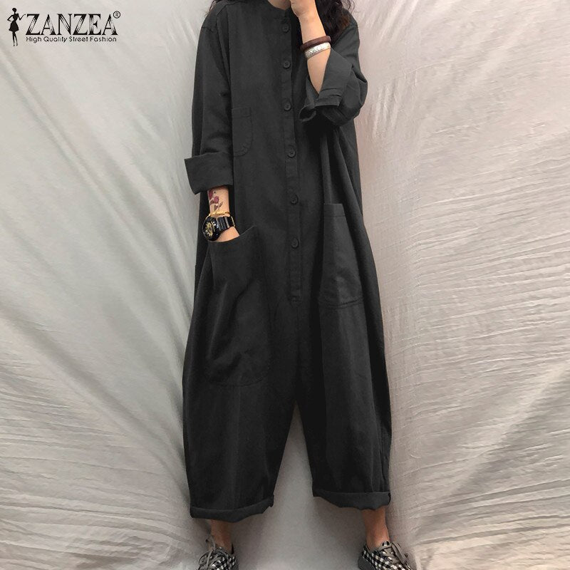 Women Jumpsuit 2022 Female Oversized Romper ZANZEA Autumn Loose Pockets Overalls  Casual Solid Stand Collar Bottom
