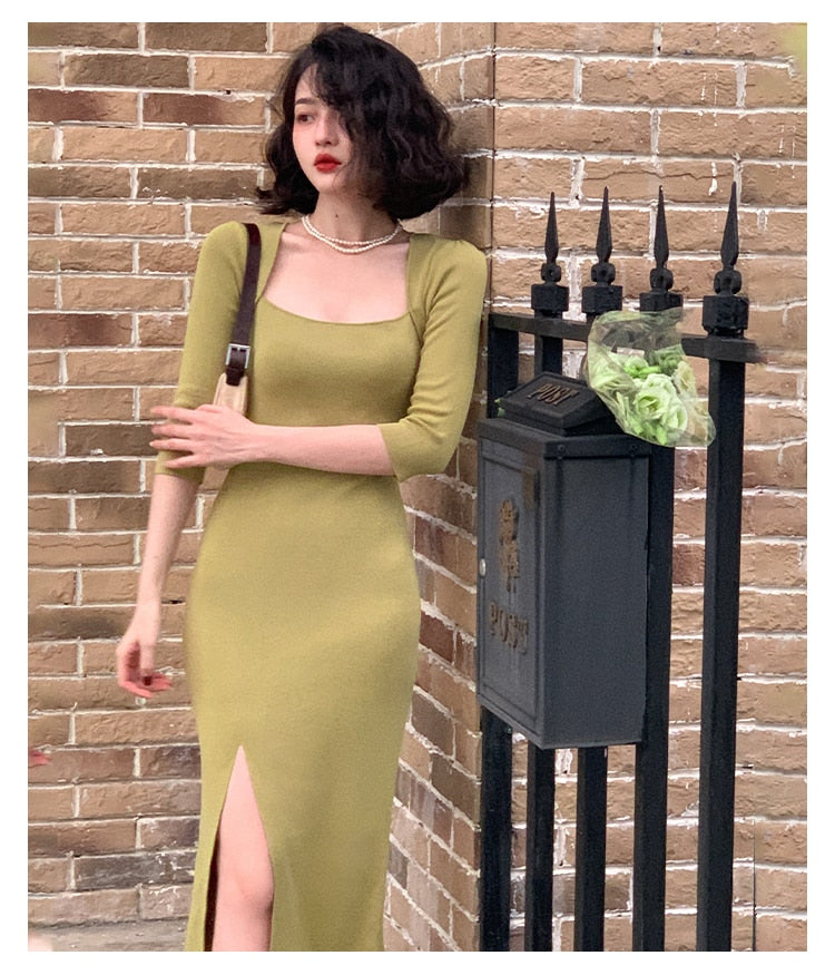 Women Retro Casual Autumn New Sexy Party Knitted Dress Slim Slit Mid-Length Elegant Female Vestidos