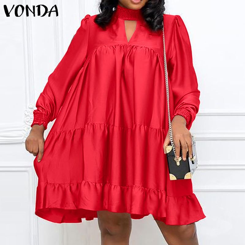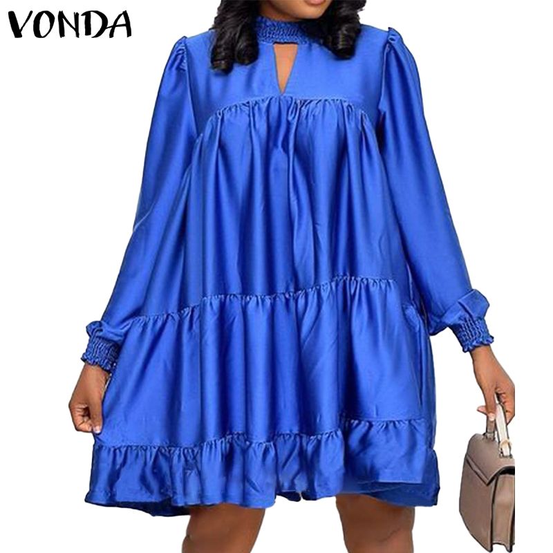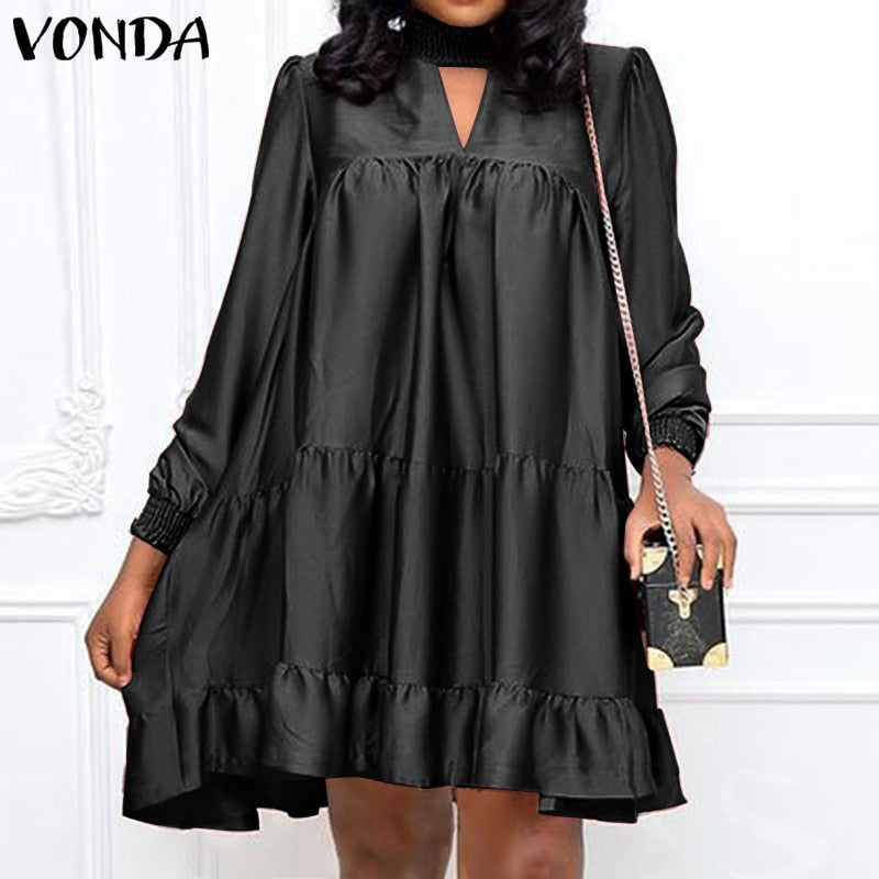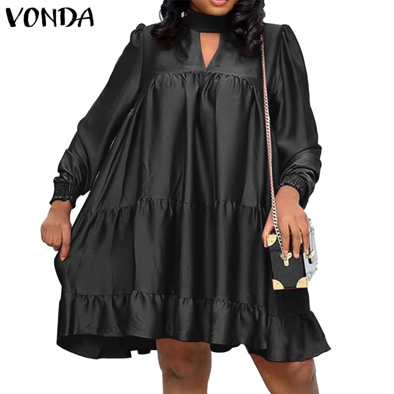 Women Satin Shirt Dress Elegant Knee-Length Dress 2022 VONDA Female Casual Solid Color Lace Long Sleeve Vestido Robe