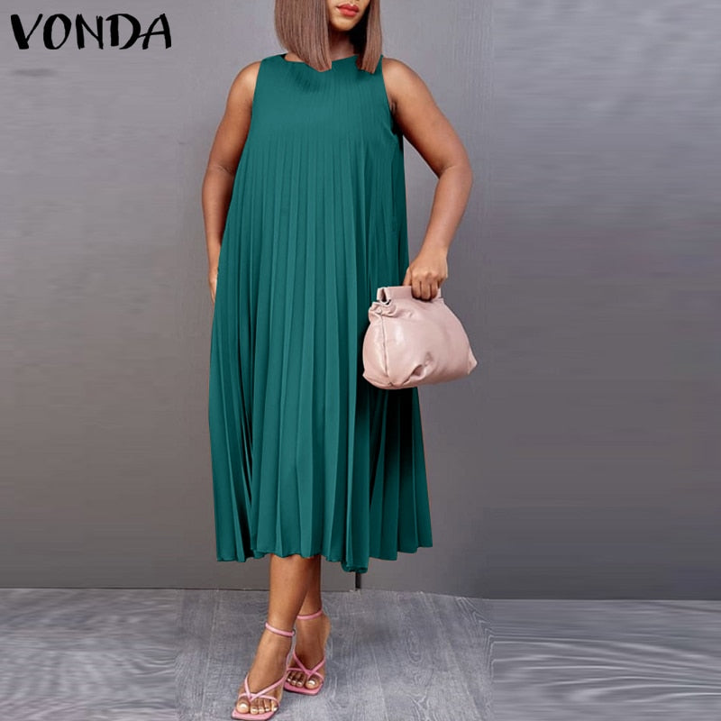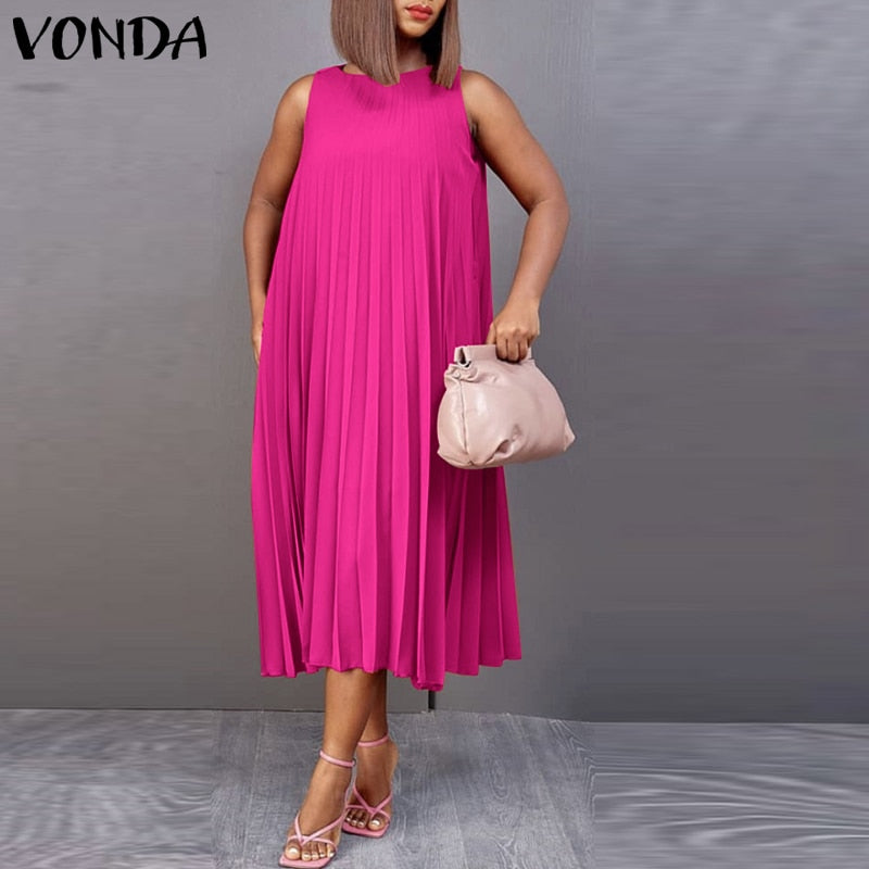 Women Sleeveless Dress 2022 VONDA Holiday Sundress Vintage Round Neck Tunic Dress Beach Casual Solid Color Vestido Robe Femme