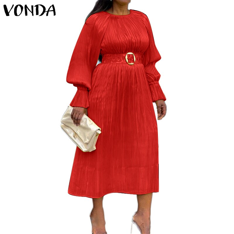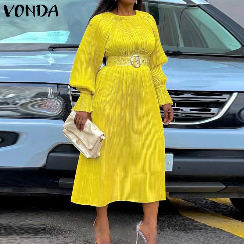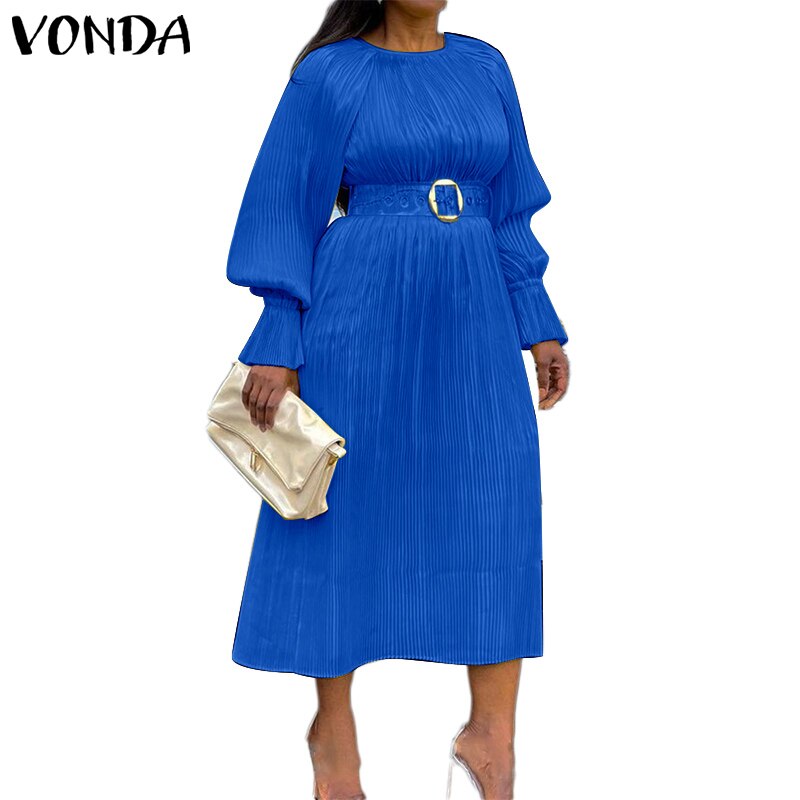 Women Solid Dress VONDA Women Long Sleeve O Neck Party Dresses High Waist Pleated Robes Loose Office Formal A-Lined Vestidos