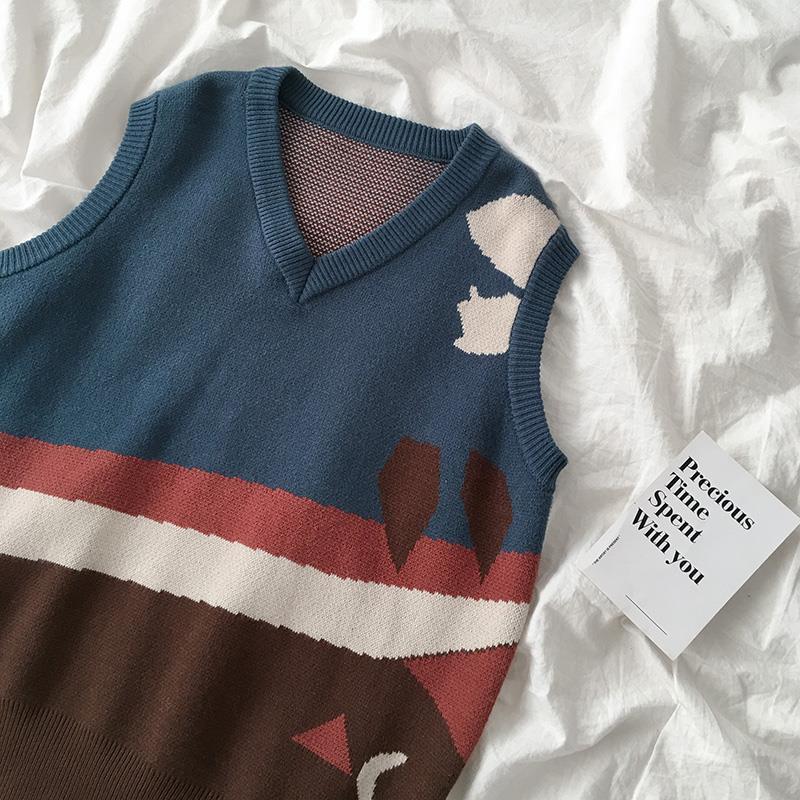Women Sweater Vest Autumn Geometric Panelled Retro Harajuku Korean Style Trendy Casual Chic Womens Sweaters Students Ins BF New