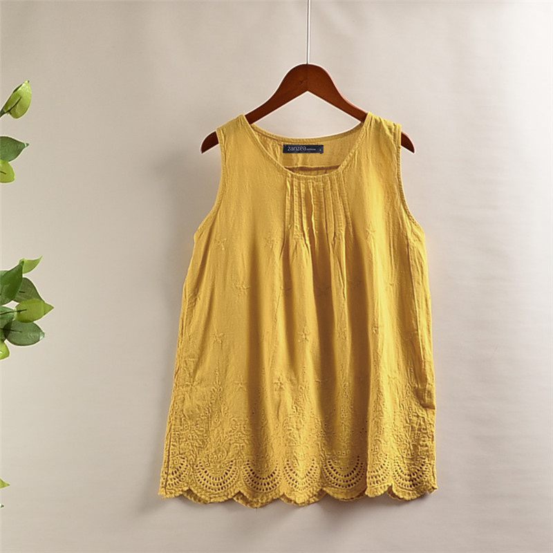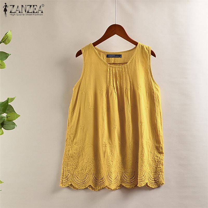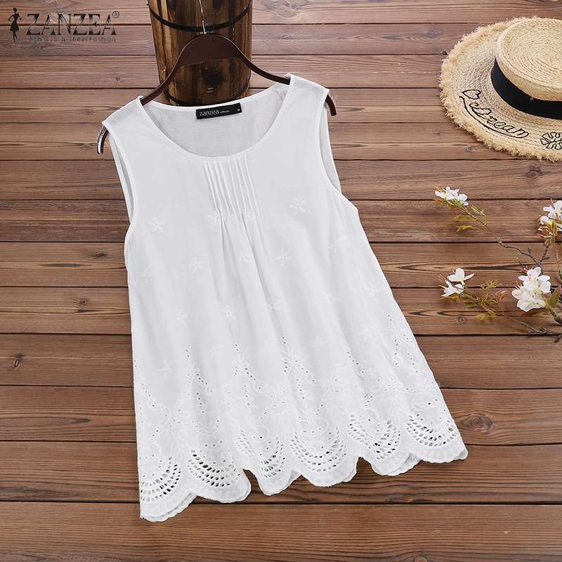 Women Tanks Tops ZANZEA Summer Sleeveless Cotton Linen Blouse Hollow Out Shirt Vintage Embroidery Tops Female Solid Blusas
