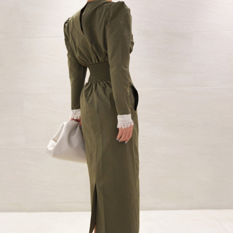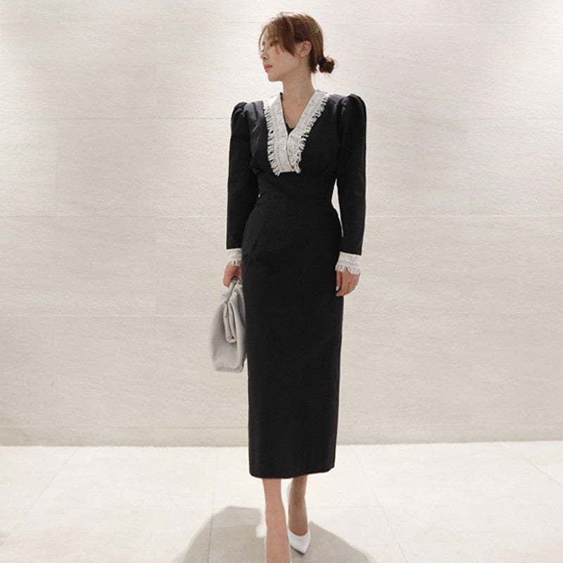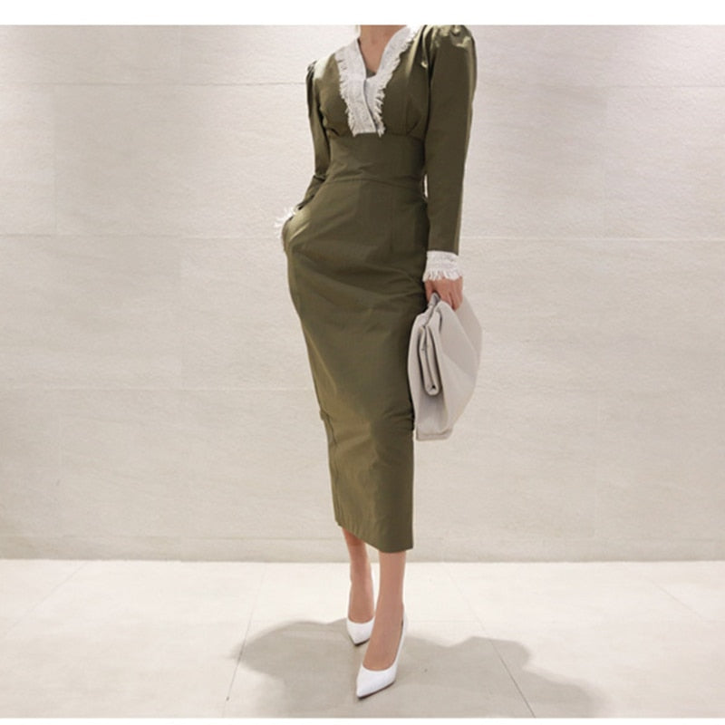 Women Vintage Party Midi Dress Long Sleeve lace collar Solid Casual Elegant Dress 2020 Spring New Fashion Dress