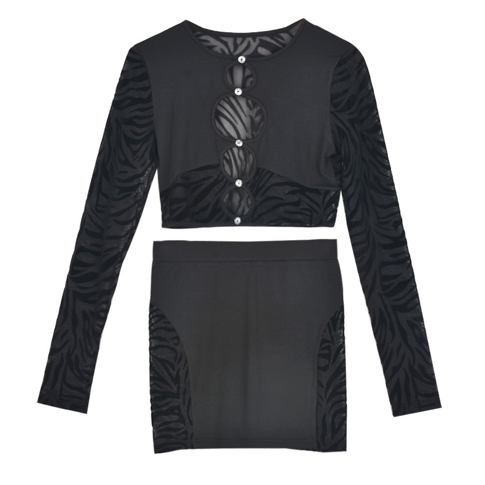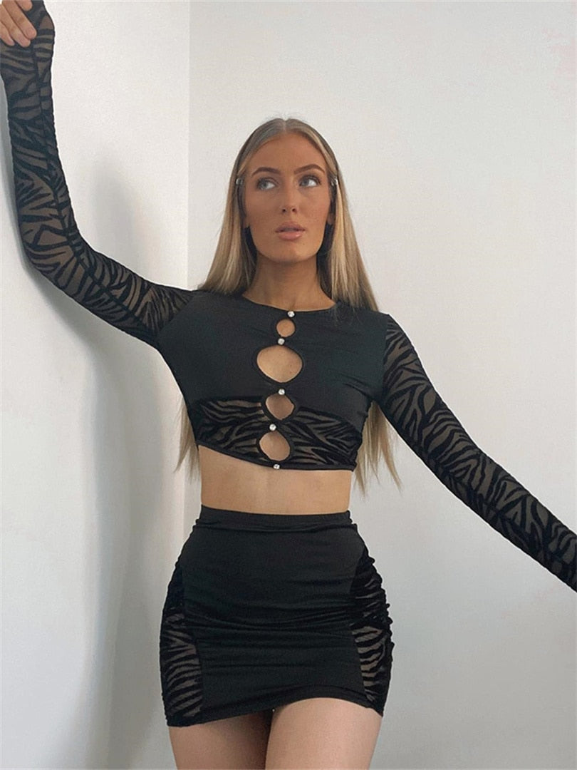 wsevypo Mesh Patchwork Two-Piece Skirt Suits Women Summer Matching Sets Long Sleeve Hollow Cut Out Crop Tops+Bodycon Skirts