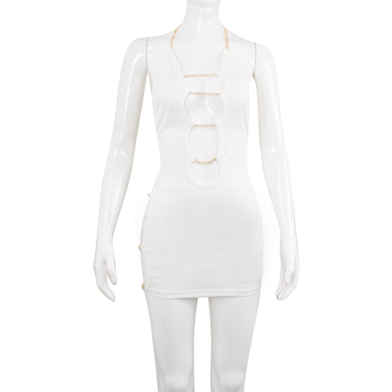 wsevypo Metal Chain Halterneck Bodycon Dress Women Sexy Sleeveless Cutout Hollow Mini Dresses Club Streetwear Backless Dress