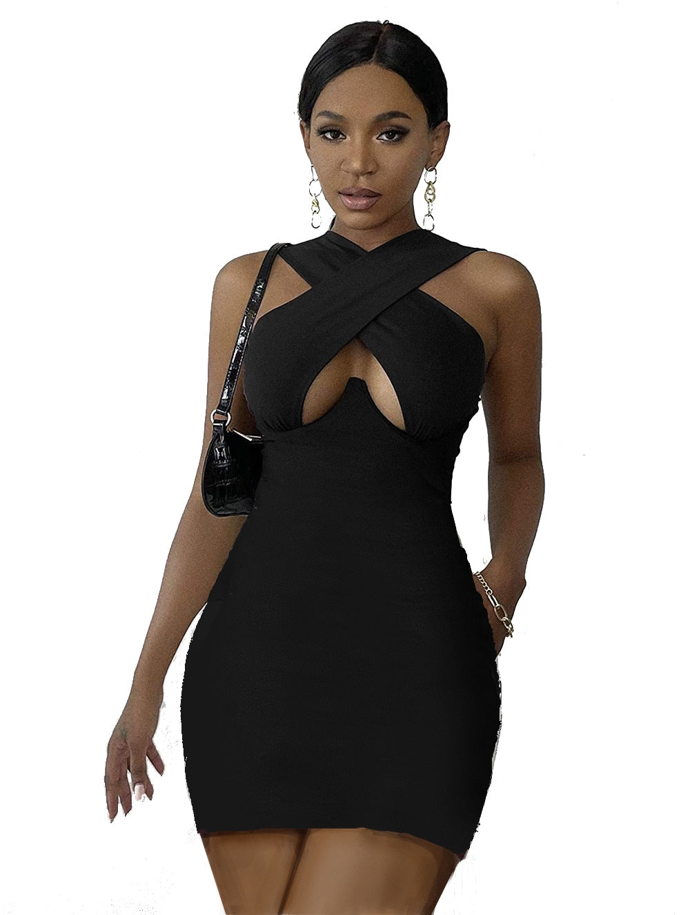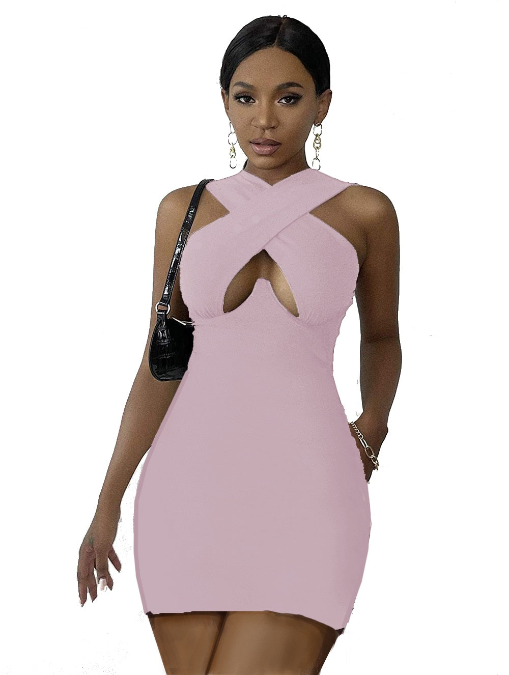 wsevypo New Solid Color Cut Out Front Wrap Mini Dress Summer Office Lady Cross Halter Neck Sleeveless Pencil Dess Women Clothes