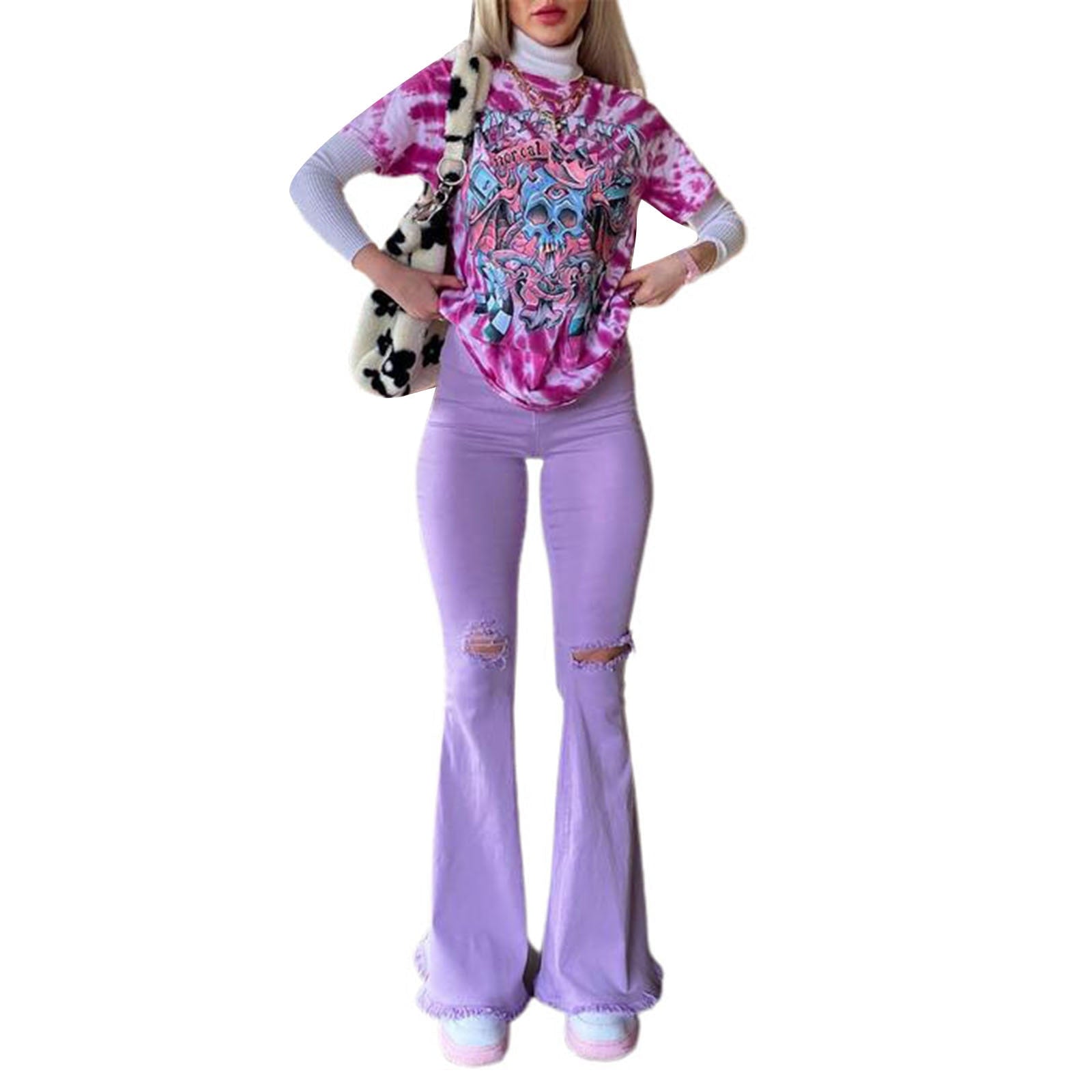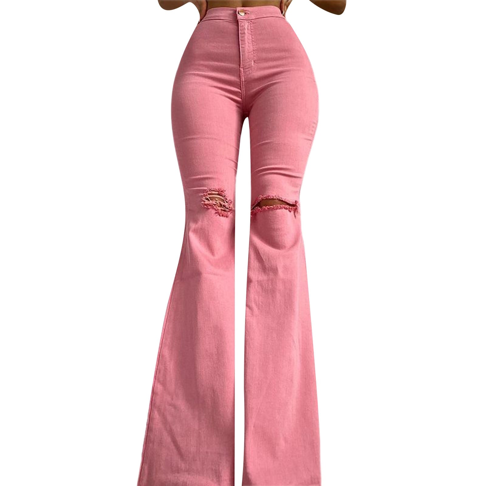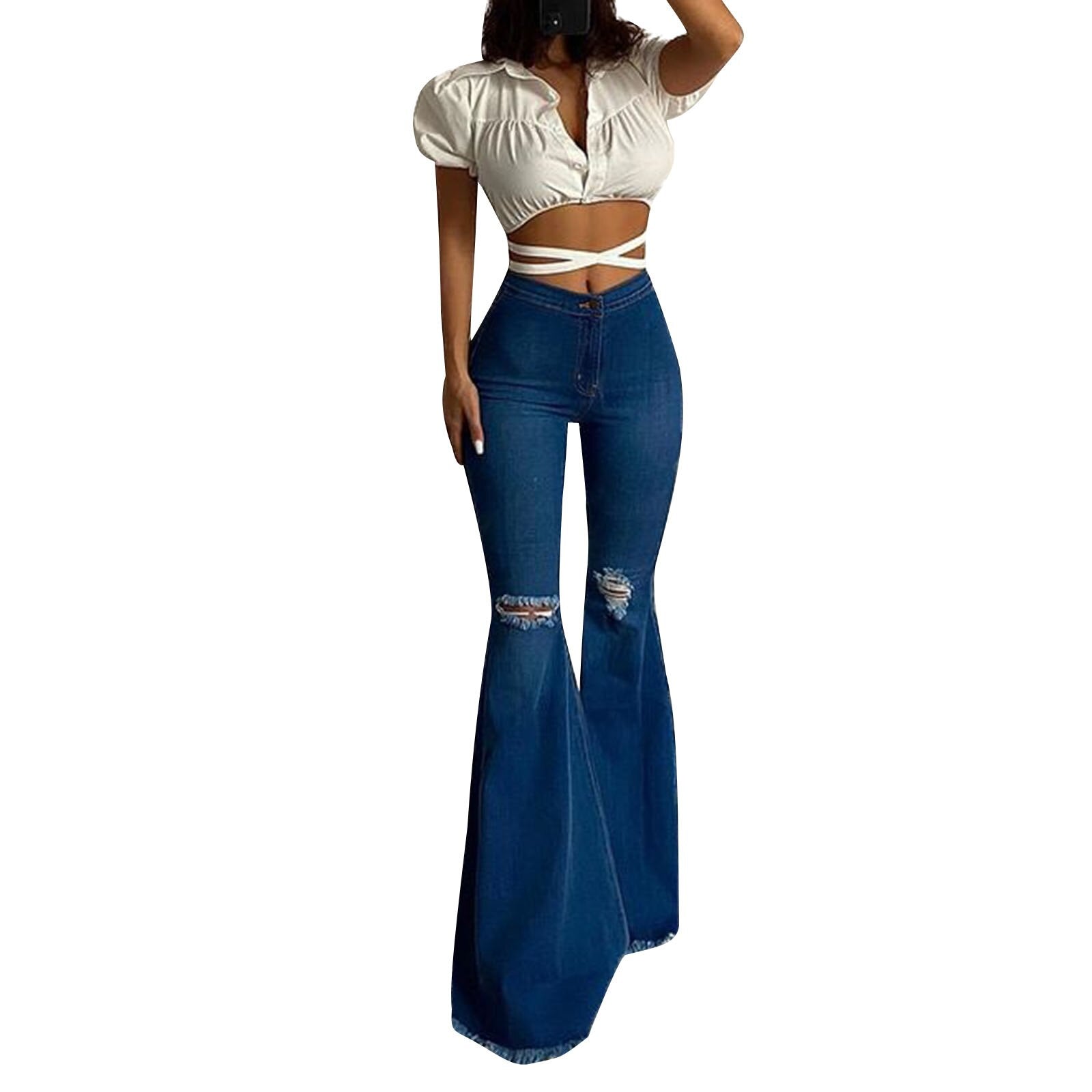 wsevypo New Women Denim Flared Pants High-waisted Button Holes Ripped Bodycon Bell-Bottoms Trousers Solid Tight Summer Clothing