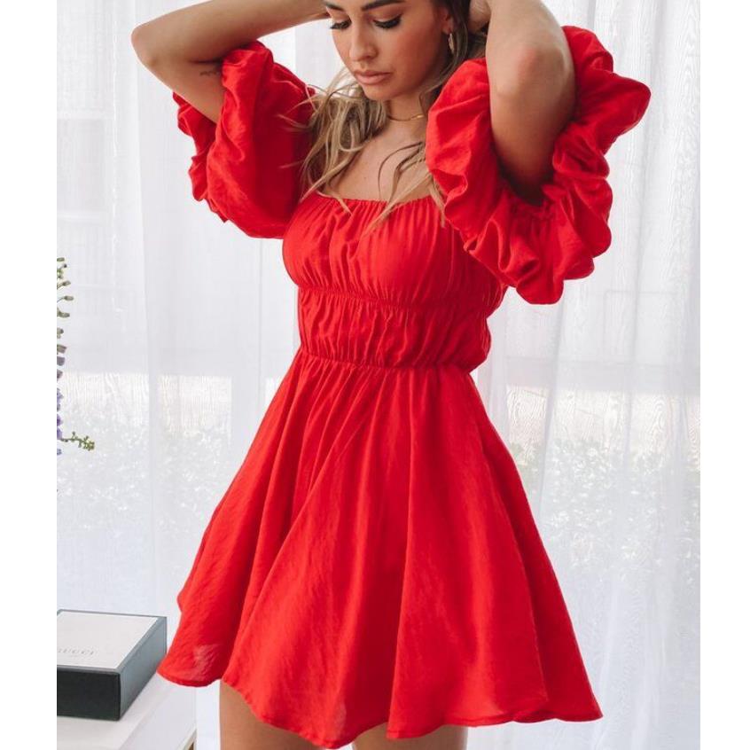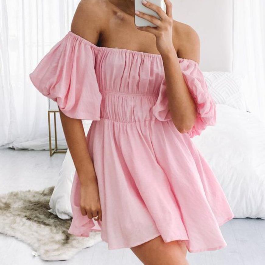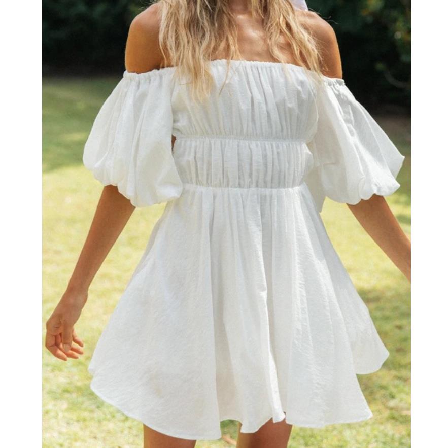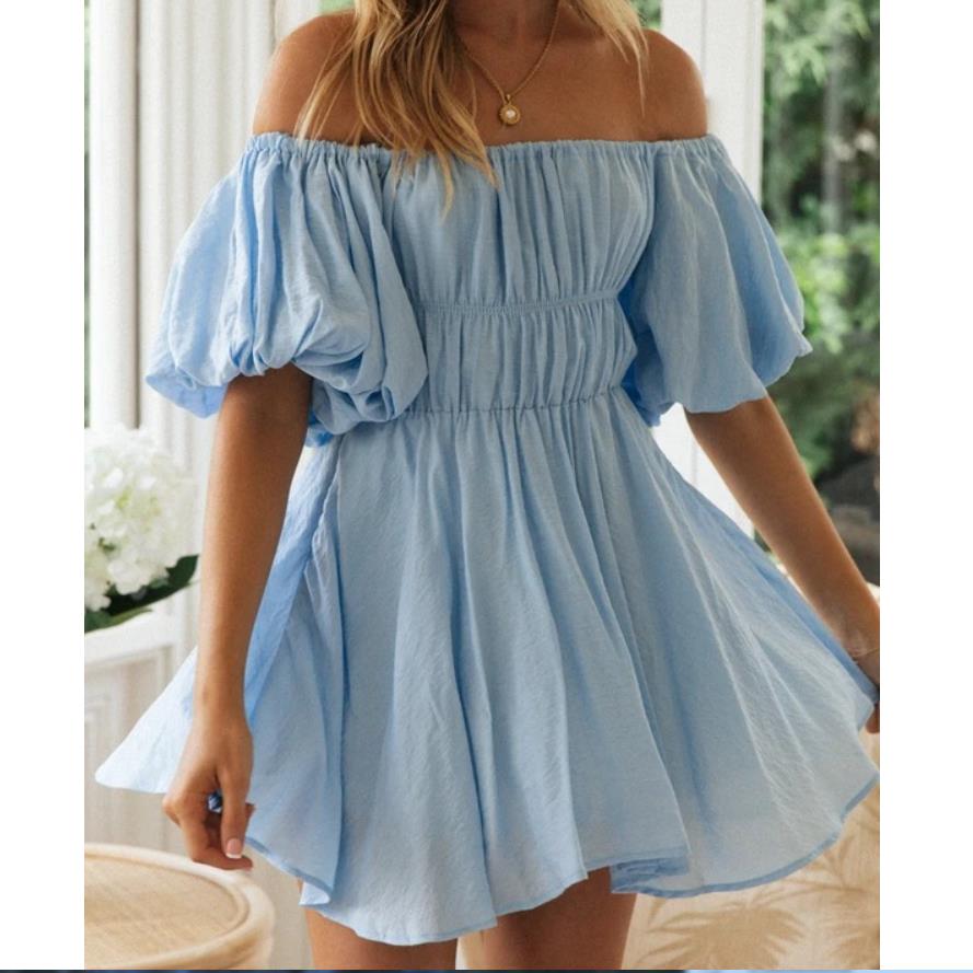 wsevypo Off Shoulder Flared Mini Dress Summer Women Solid Color Short Lantern Sleeve Short A-Line Party Vacation Beach Clothes