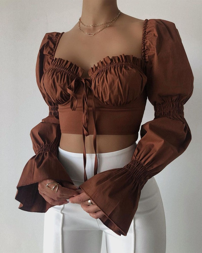wsevypo Puff Long Sleeve Ruffle Lace-up T-Shirt Elegant Fashion Women Square Collar Bustiers Crop Tops Autumn Winter Clothes