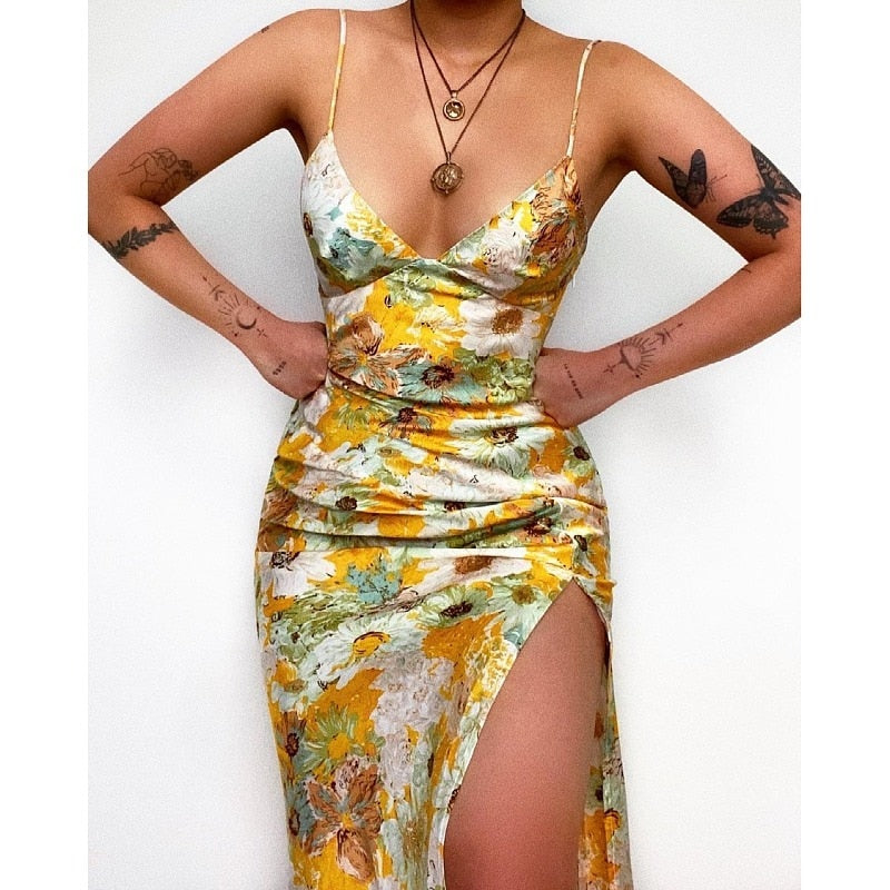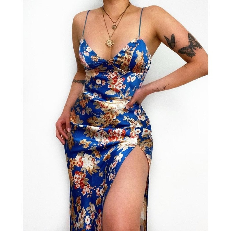 wsevypo Sexy Spaghetti Straps Floral Midi Dress for Women Backless Side Split Bodycon Sundress Party Night Clubwear Vestidos