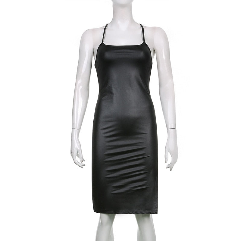 wsevypo Sexy Suspender Midi Bodycon Dress Party Club Women’s Black PU Leather Bandage Backless Split Dress Evening Vestidos