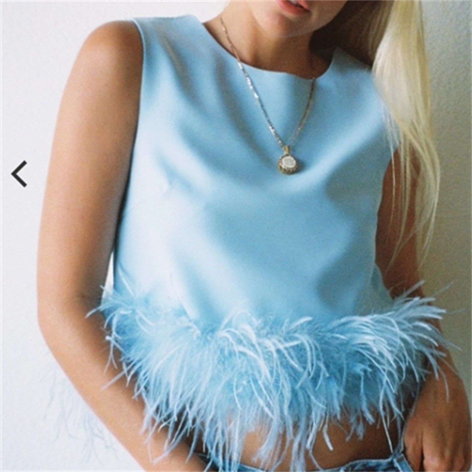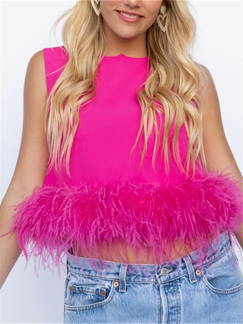 wsevypo Vintage Feather Hemline Women Tank Tops Elegant Summer Sleeveless Round Neck Crop Tops Solid Color Vest Purple/Rose Red