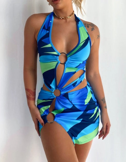 wsevypo Women Halter Short Bodycon Dress Sexy Summer Party Club Hollow Out Ring Sleeveless Wrapped Mini Sundress Cutout Clothes