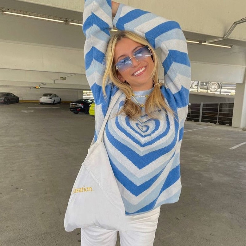 Y2K Aesthetics Heart Striped Turtleneck Pullovers E-girl Sweet Long Sleeve Hot Pink woman sweaters Harajuku 90s Knitwear Autumn