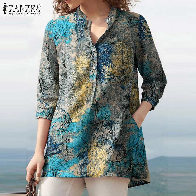 ZANZEA 2022 Autumn Shirt Vintage Women Floral Printed Tunic Tops Casual Loose Blouse Chemise Bohemian 3/4 Sleeve Work Blusas