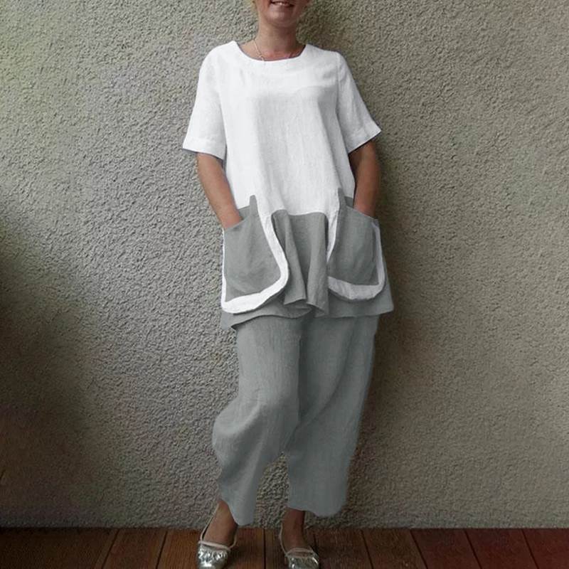 ZANZEA 2pcs Summer Urban Tracksuit Women Loose Patchwork Cotton Matching Sets Casual Pant Sets Vintage Short Sleeve Blouse Suits