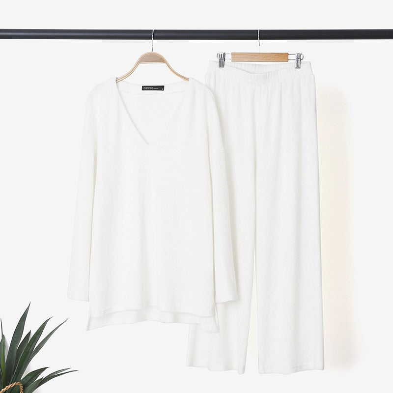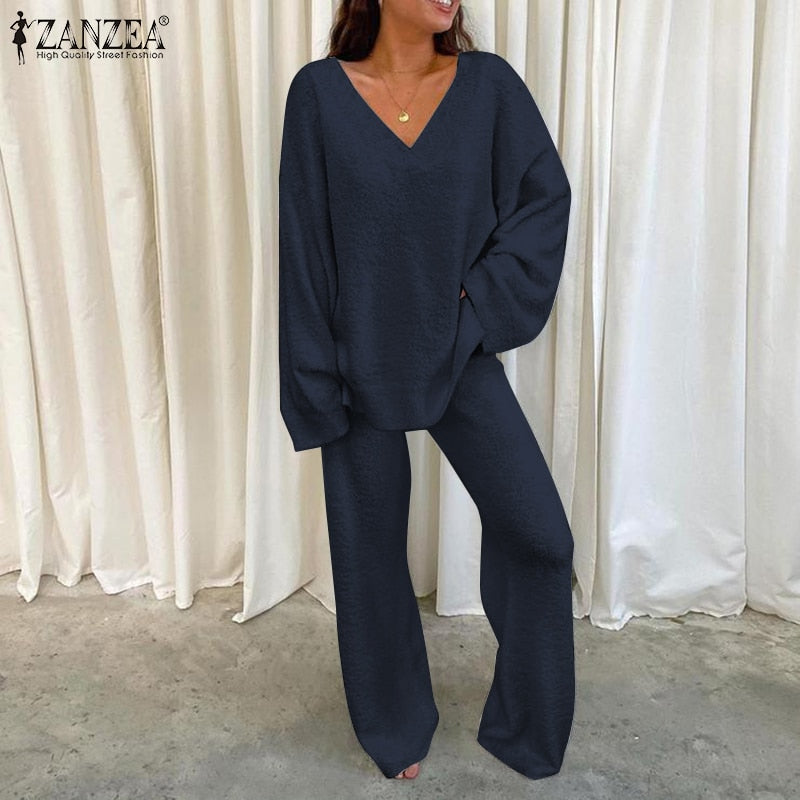 ZANZEA 2pcs Women Autumn V Neck Long Sleeve Blouse Suits Matching Sets Casual Loose Wide Leg Trousers Sets Solid Homewear Suits