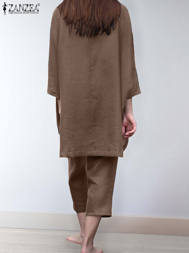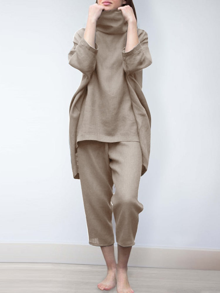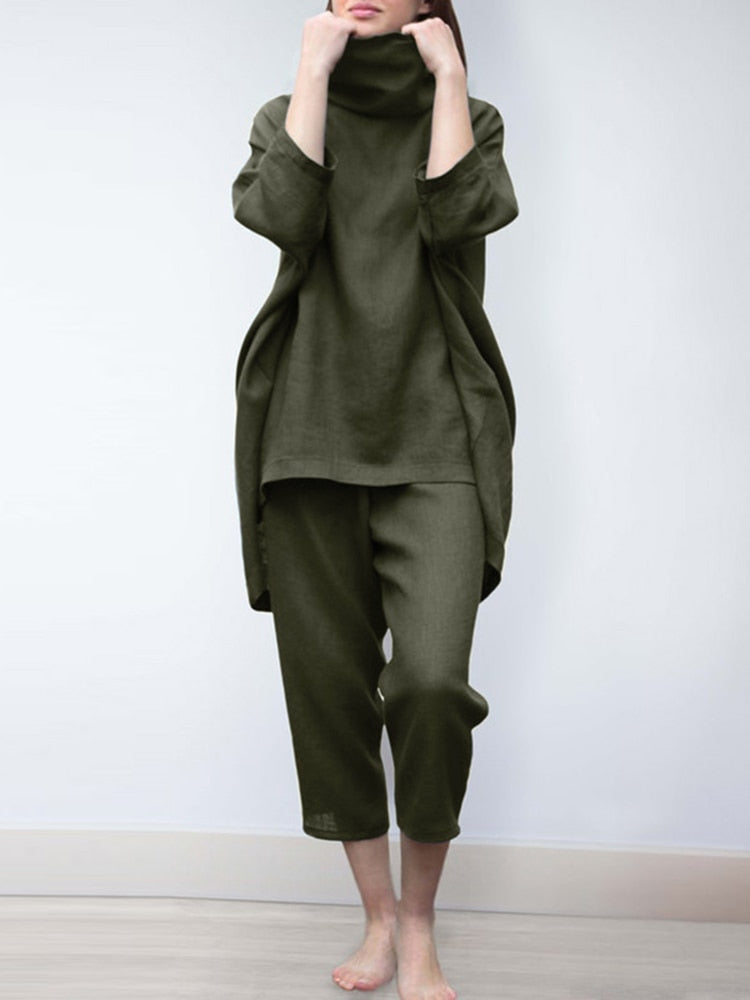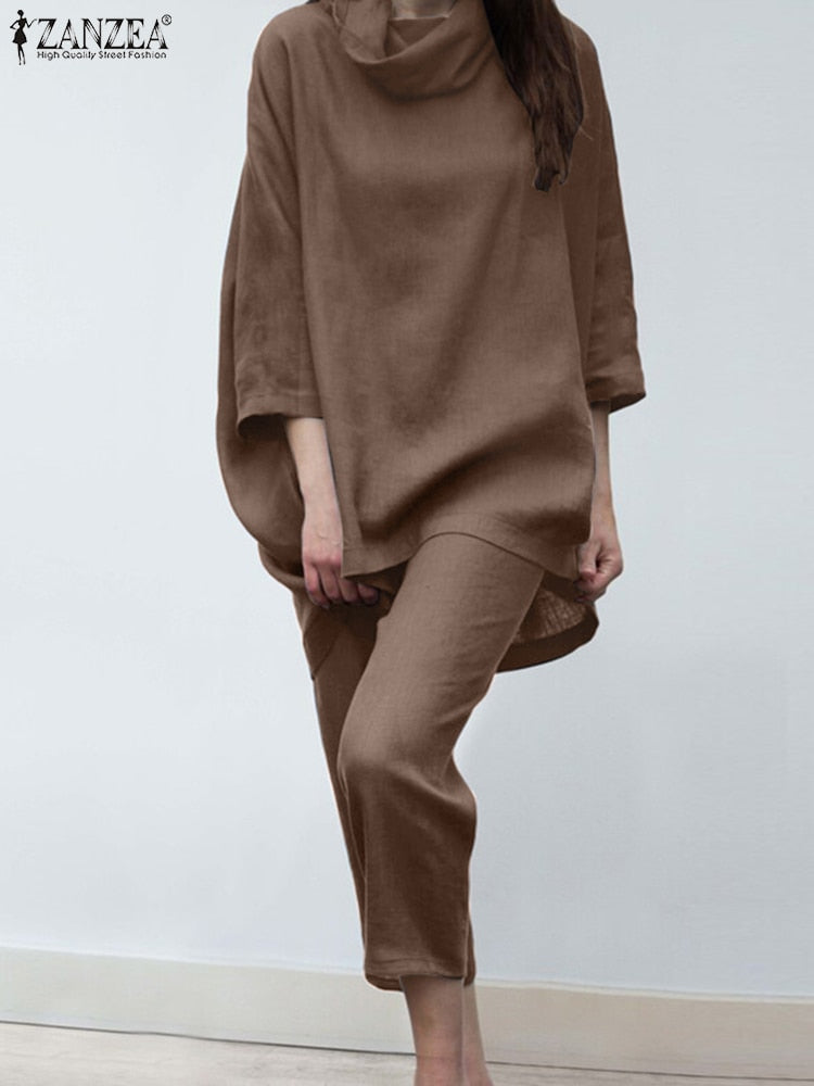 ZANZEA 2pcs Women Trouser Suits Spring Fashion Solid Urban Tracksuit Matching Sets Trutleneck 3/4 Sleeve Blouse Harem Pants Sets