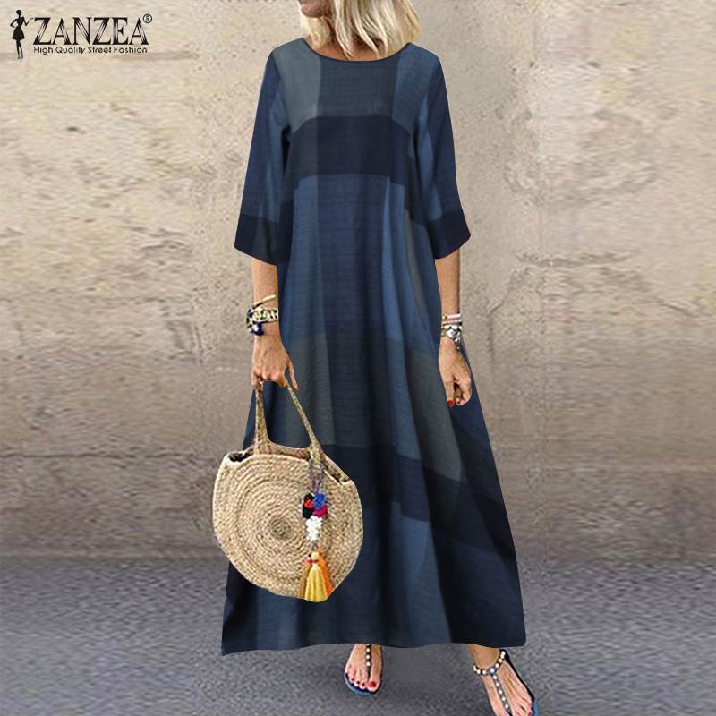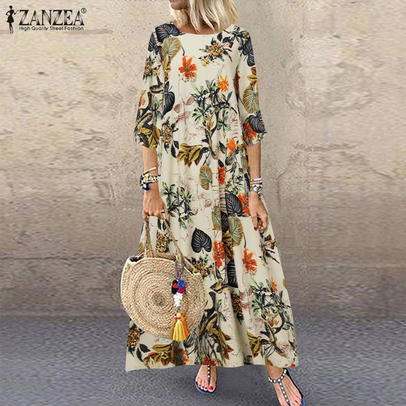 ZANZEA Autumn 3/4 Sleeve Polka Dot Printed Long Dress Vintage Women's Cotton Linen Dresses Female Kaftan Vestido Femme Sundress