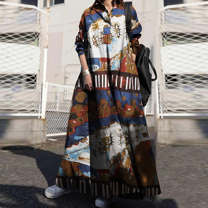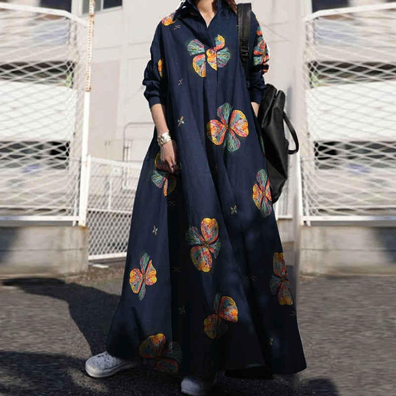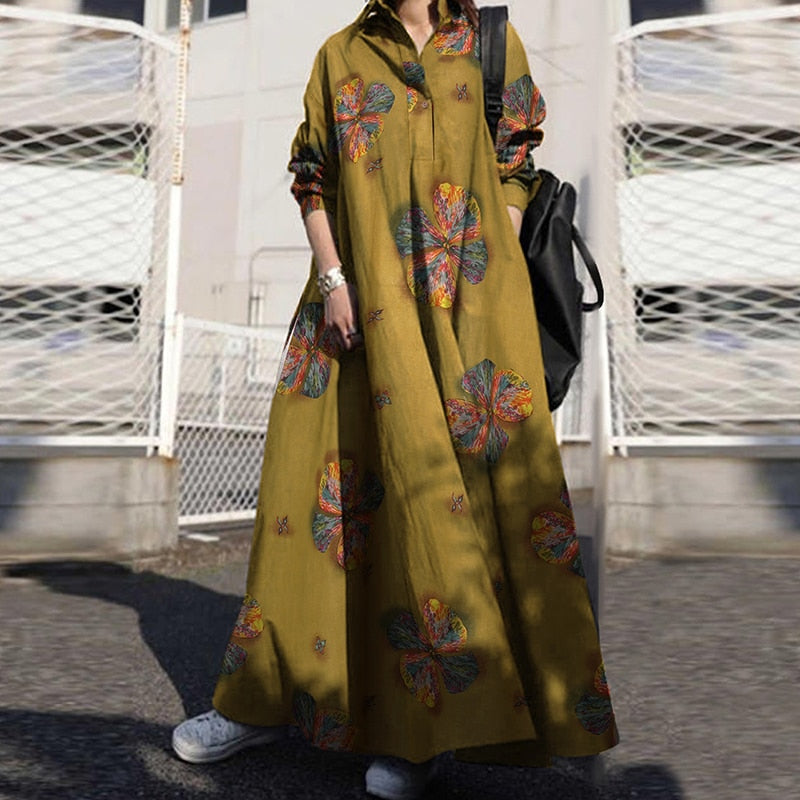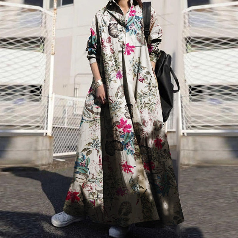 ZANZEA Autumn Stylish Women Vintage Long Sleeve Loose Sundress 2022 Casual Long Maxi Dress Kaftan Femme Solid Party Vestido Robe
