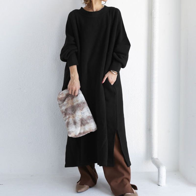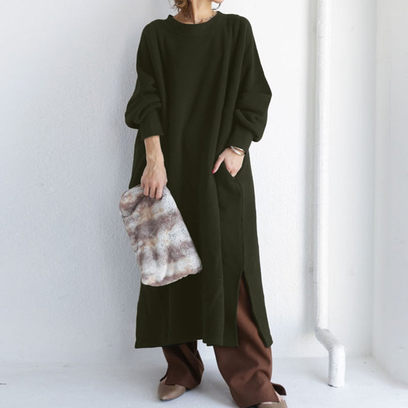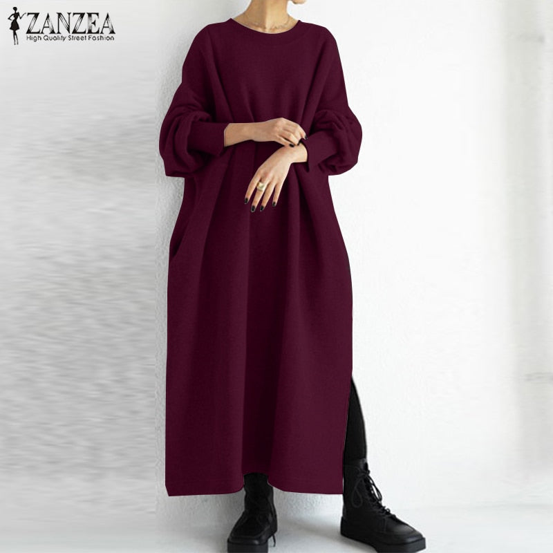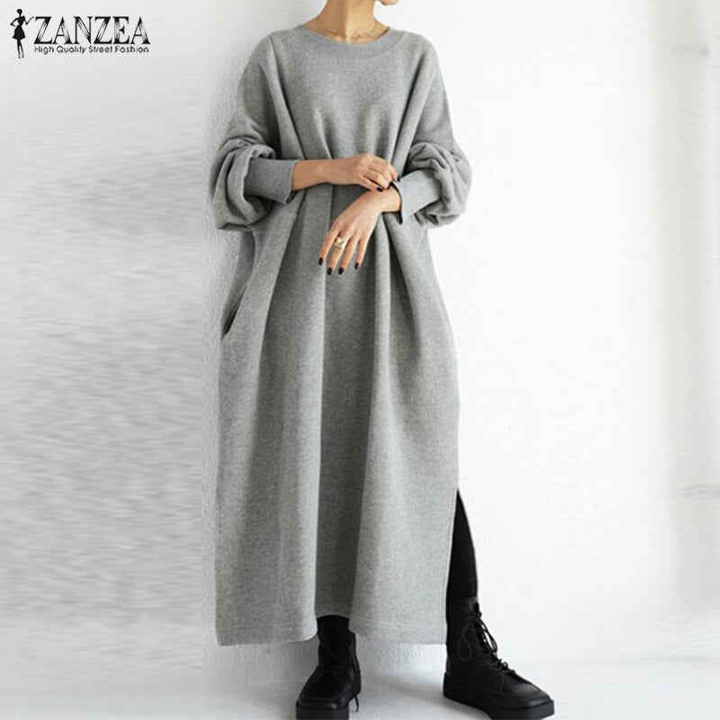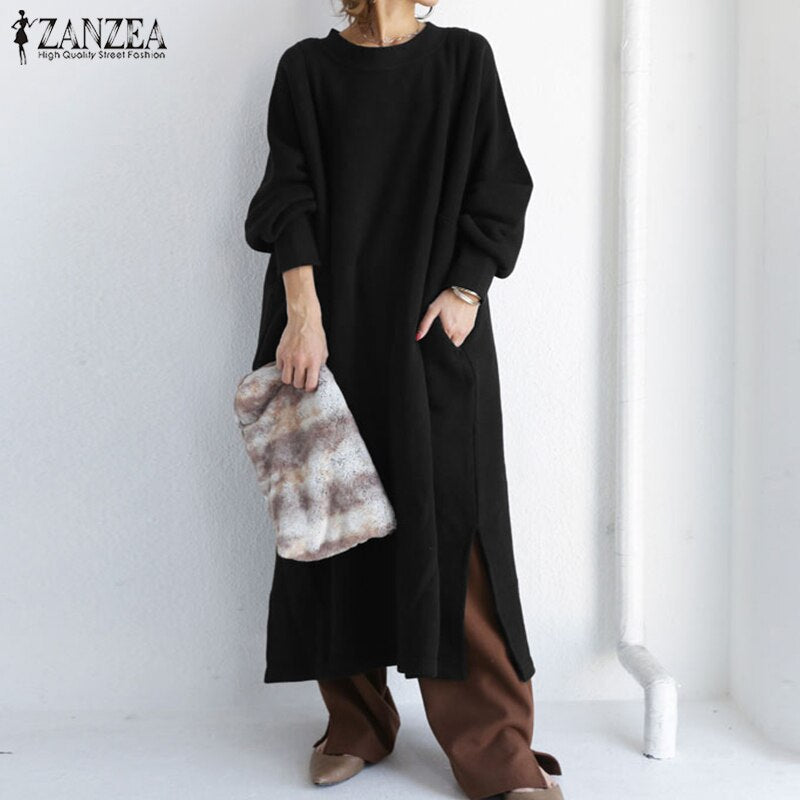 ZANZEA Autumn Winter Sundress Casual Long Sleeve Loose Sweatshirt Dress Split Hem Long Vestidos Solid Baggy Fleece Pullover